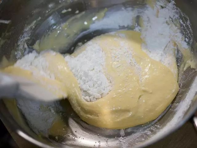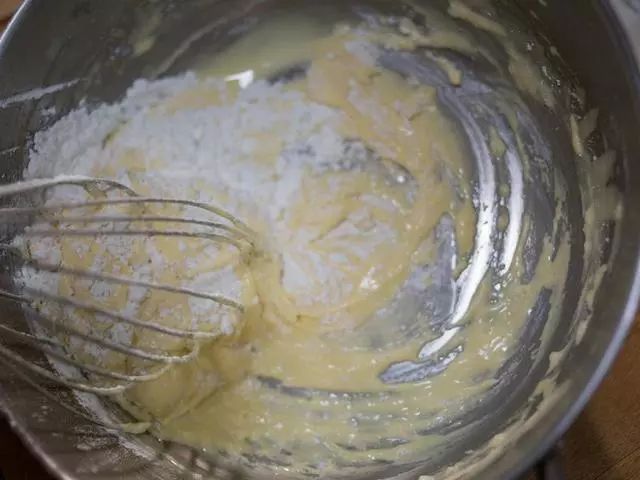 7、接着分两次加入过筛面粉与牛奶,面粉轻轻搅拌至看不到粉粒即可。