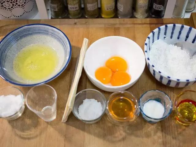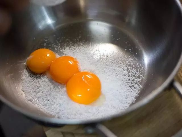 3、开始面糊部分,在搅拌盆内放入砂糖与蛋黄。