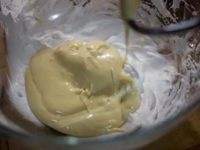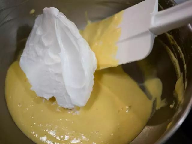 14、再将上述混合体放入剩余蛋白霜盆内,轻轻搅拌均匀。