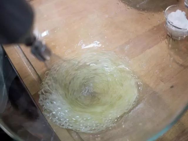 10、接着开始打发蛋白霜,使用冰过的鸡蛋蛋白,先用打蛋器打至稍微起泡,分次加入砂糖与柠檬汁持续打发。