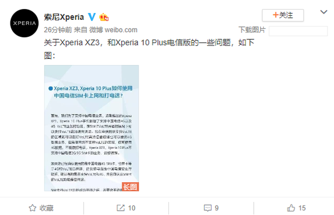 索尼官方表示,为了支持中国电信业务,近期推出的索尼 Xperia XZ3 和 Xperia 10 Plus手机新增了支持中国电信4G以及4G VoLTE业务的功能。需要注意的是,索尼 Xperia XZ3 和 Xperia 10 Plus不支持中国电信2G/3G SIM卡的业务。