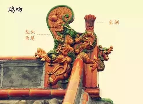 “鸱吻”是屋脊两端高高耸起的装饰构件,其形状为龙头鱼尾,头朝内,张嘴朝向屋脊,尾部上翘做卷曲状。“鸱”相传是龙的九子之一,海中神兽,能喷浪降雨。