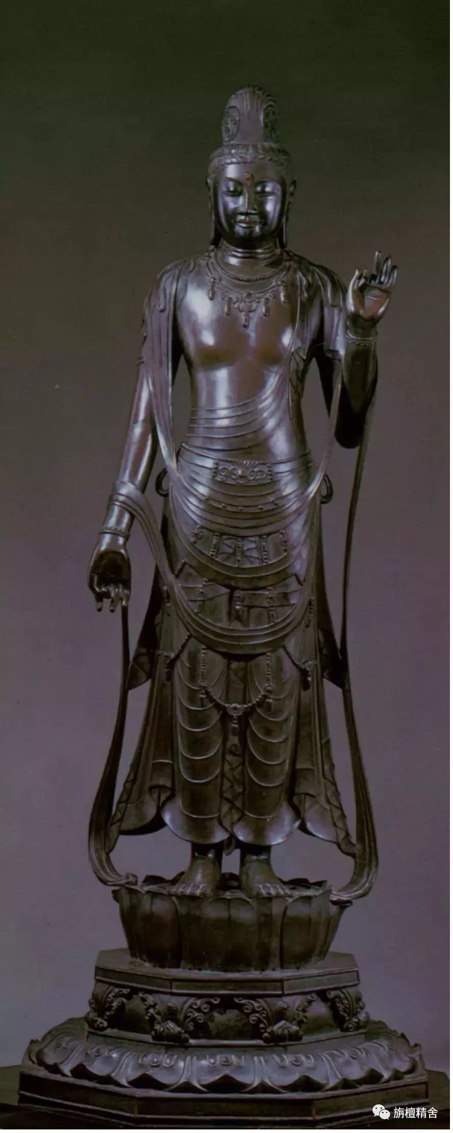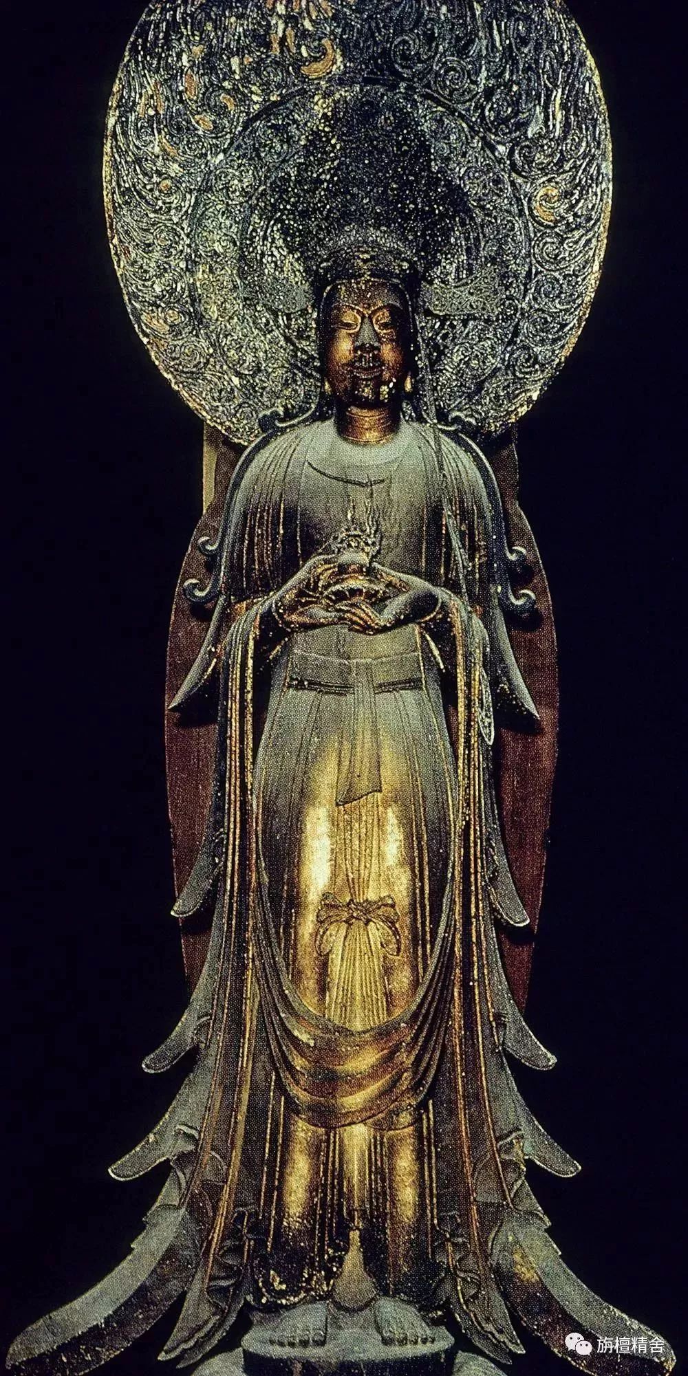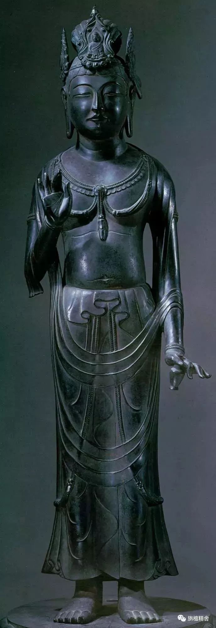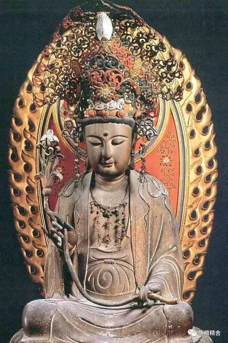 这是一尊极为精美传神的七世纪唐代白檀木雕十一面观音菩萨立像。观音菩萨神态深沉安详、容姿华贵庄严、饰品繁复精美、衣纹简洁流畅,整尊造像高贵典雅,慈悲庄严、大气舒展,精准再现了有关记载十一面观音造像法的经典原貌。这尊十一面观音像也成为了日本流传至今的十一面观音菩萨像的模板。