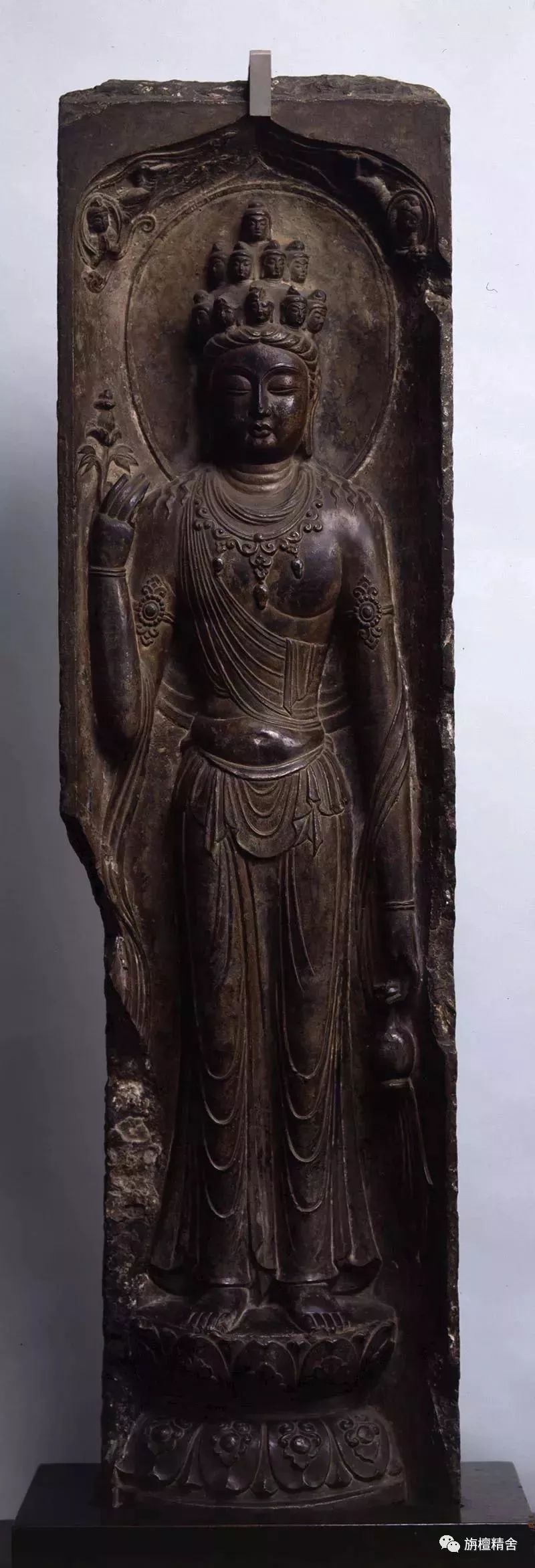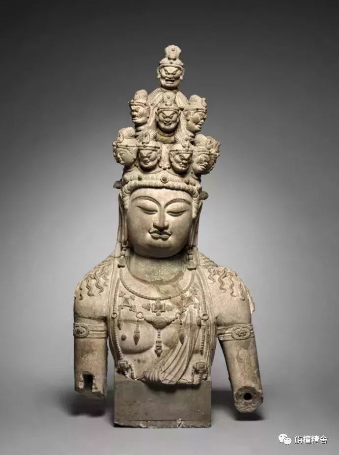 这是一尊高深度浮雕的十一面观音菩萨像,从雕像背面痕迹可以看出,此像是从某一石窟的山岩上生硬剥离而来,博物馆未说明来自中国哪一石窟。