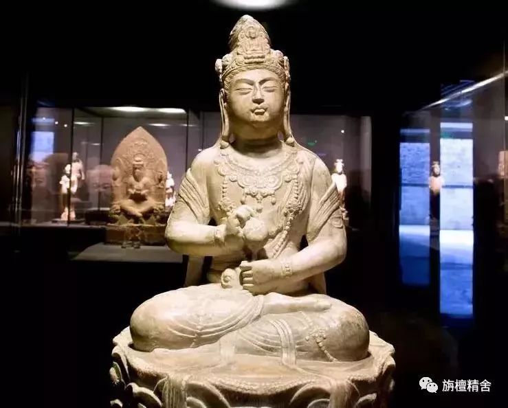 石质,为头戴本特冠饰的刹帝利形象的菩萨像,左手持莲花,倚坐在莲花之上的藤椅中,右脚压在左腿膝上。藤椅两端雕刻的男女形象似代表布施者。这种半跏思惟菩萨像在犍陀罗较为少见。
