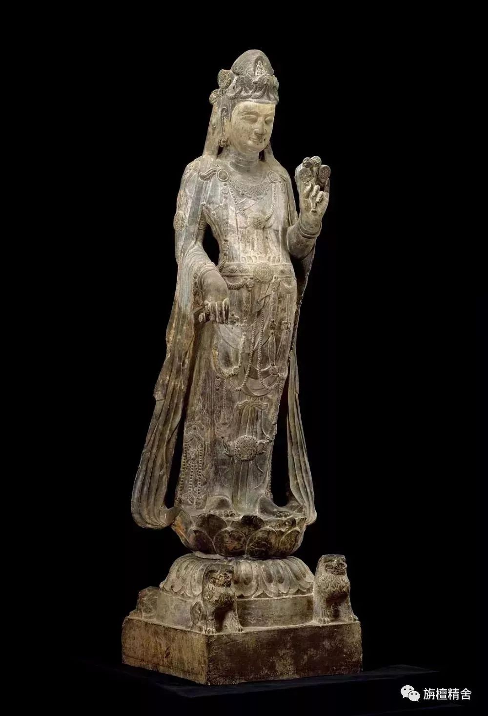 美国波士顿博物馆的注释:“圆雕造像,高249厘米,石灰岩。据传,此像1909年日人早崎梗吉出土于陕西西安古寺,今藏于美国波士顿美术馆。菩萨跣足立,面形圆润,眉目清秀,表情慈善、安详,腹部前鼓,体态趋向S型,然尚不具备典型一波三折造型的自然感觉,肌肉表现力亦不甚强。菩萨左手持四莲蓬,右手亦执莲蓬。冠饰化佛、葵饰与缨络,宝缯下垂。着裙,挎披帛,戴臂钏、胸饰,佩带,挂缨络。周身敷彩,绚丽辉煌。座为束腰仰覆莲式,方形底座四角刻立、卧雄狮。此执多莲蓬形式的观音极罕见,装饰繁缛、豪华,造型较优美,系隋菩萨像之佳品。”