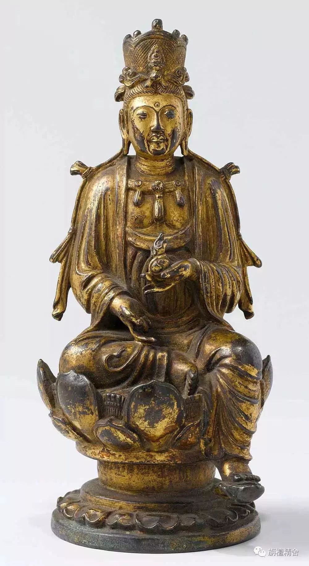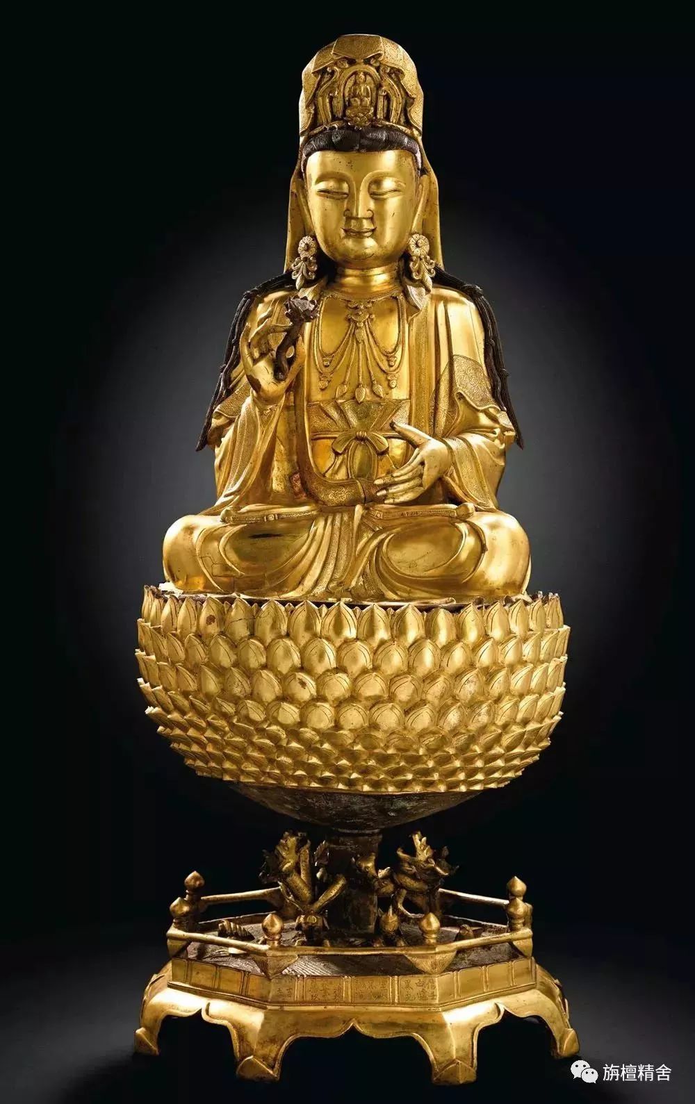 此鎏金铜观音菩萨坐像风格造型独特;面相端雅,神情慈祥温婉,却又蓄卷曲胡须,既富阳刚特征却又不失阴柔,且铸造工艺超凡,无疑乃鎏金铜造像精品,诚属稀珍。