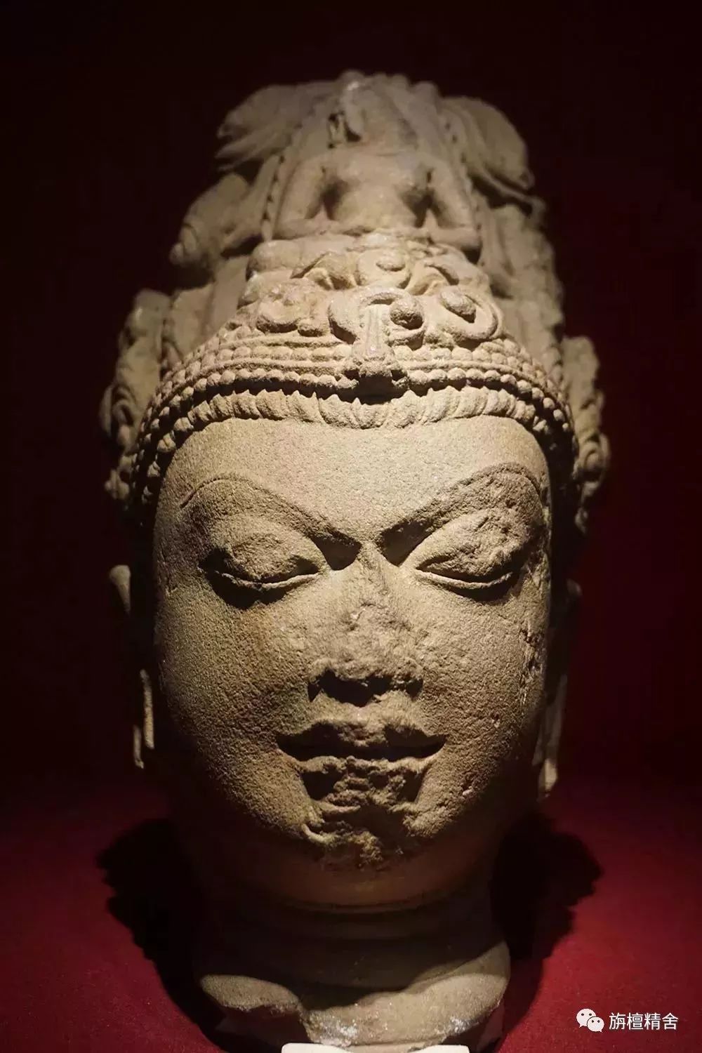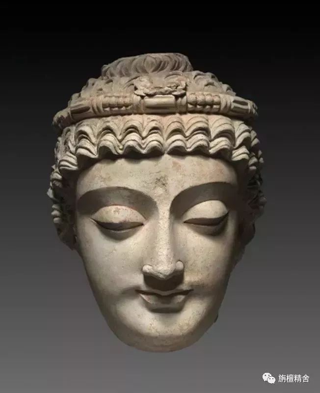 这尊精美绝伦的四世纪晚贵霜时期的犍陀罗造像,被认定为是观世音菩萨的头像。因为在发髻上部有莲花座残留的痕迹,此莲花座被认为是化佛阿弥陀佛的法座,由此克利夫兰美术馆的专家们判定此像为《观音菩萨头像》。