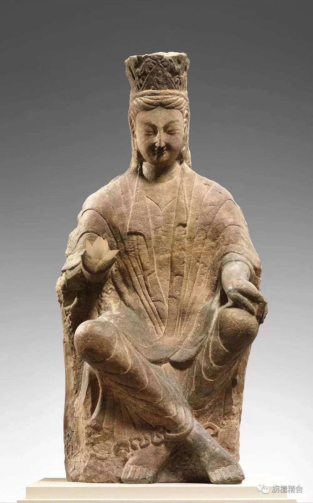 美国大都会艺术博物馆收藏的这尊交脚菩萨石雕像,制作年代为公元480-490年之间,距今已有1500多年的历史。交脚观音菩萨头戴宝冠,冠中有小化佛。面呈微笑,弯眉细目,直鼻小口,目微闭而含情,俯视着芸芸众生,似乎随时准备闻世间疾苦之声而前往救助。菩萨肩披披帛,下着贴体长裙,衣饰线纹流畅,手法简洁。右手似施无畏印(缺损),左手自然下垂抚膝,双腿交叉而坐。神情自若,姿态典雅端庄。整体比例精当匀称,舒展大气,给人以回味不尽的美感。