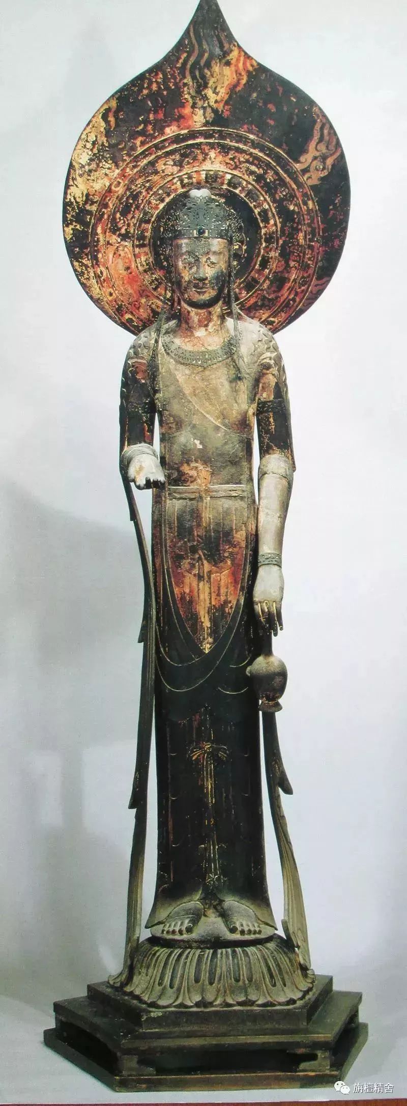 此九面观音菩萨立像系唐初七世纪后半时期制作,养老三年(719年)流入日本。菩萨脸庞丰满圆润,曲眉丰颈,五官秀美,体态丰腴,尽显盛唐时期佛像特征。上身袒露至腹,下穿罗裙,腰部有束带。服饰华美,帔帛环绕,璎珞精致,衣服轻薄透体,纹线流畅自然。 左手持净瓶,右手自然垂下持佛珠,跣足立于莲座之上。