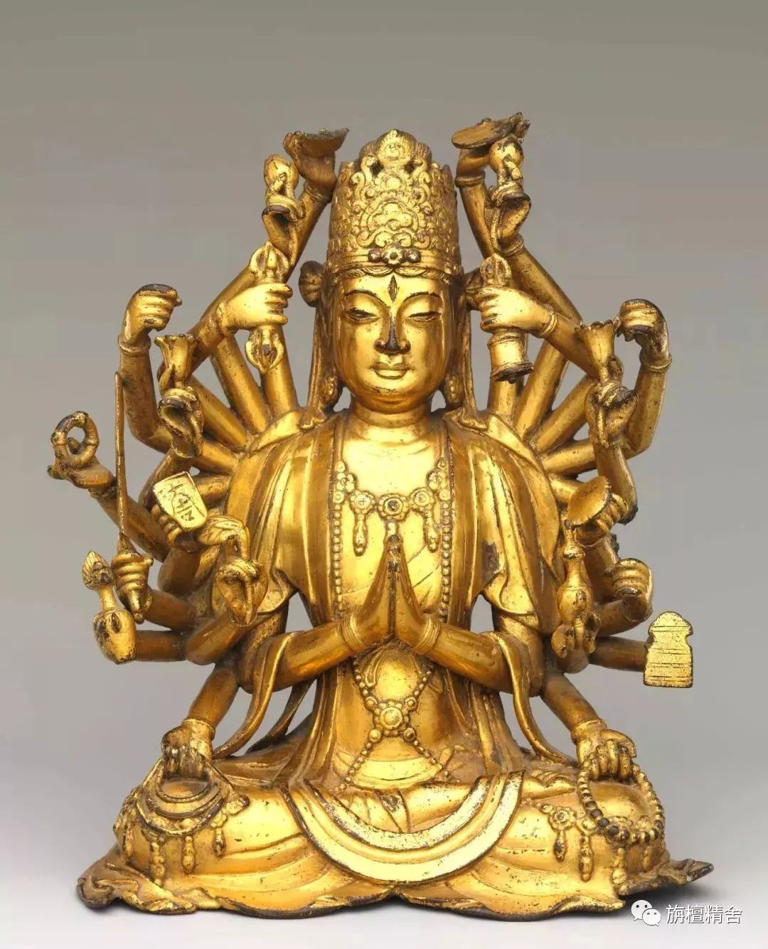这是一尊十分稀有的云南大理国铜鎏金千手观音菩萨坐像,其最大的特色是通体共有二十二只手,全部采用圆雕,结构稀疏排列有序,这是非常少见的。观音菩萨头戴宝冠,二侧发绺垂肩,面相圆润端庄,神态慈悲安详。身佩璎珞、手镯及挂珠庄严全身。共有二十二只手臂象征千臂;其中一双主臂当胸合掌,另有一双手臂向上高举日月轮,另有一双手臂膝前持套索和念珠,其余的手臂各持法器,双腿呈金刚跏趺坐安住于法座之上(法座已失)。