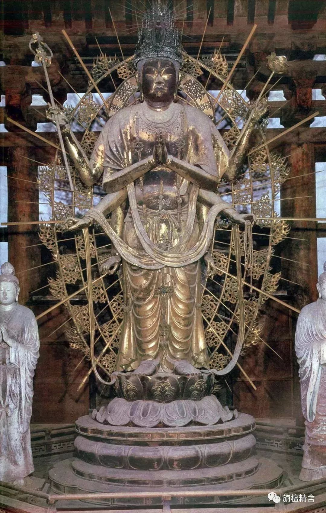 此像采用整根白檀木雕刻而成,其繁复的头饰及九面、耳饰、胸饰的璎珞、天衣、佛珠、净瓶及足下莲花座等全部是由一根白檀木雕出,其大唐匠人的鬼斧神工令日本人惊叹不已,1955年被指定为日本国宝。