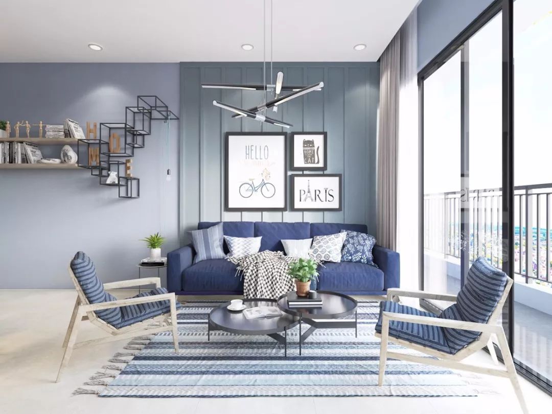 天青色是种冷静又优雅的色彩,它最搭的色彩是白色和黑灰色,以及粉色;用在客厅你可以选择原木,大理石,或者藤编来搭配,清新自然,却又不乏高级质感。