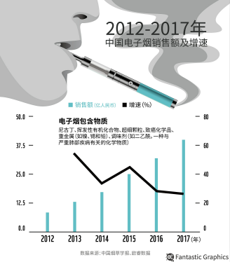 中国电子烟销售额及增速。 视觉中国 法治周末记者 管依萌 “新型烟草时代加速到来。”3月5日,电子烟创业者郭浩(化名)发了一条朋友圈,并且预测“未来十年,新型烟草烟民超过两亿人。” 原本被郭浩认为“前途光明”的电子烟市场,10天后被央视“3·15”晚会曝光了。节目着重点名了“电子烟的危害”,称其通过市场随机购买的8种电子烟烟液送往实验室检验,实验室工作人员发现部分尼古丁含量超标。央视主持人称通过科学实验证明,电子烟含有不少有害物质,危害一点儿不比香烟来得少。 在青少年群体扩散