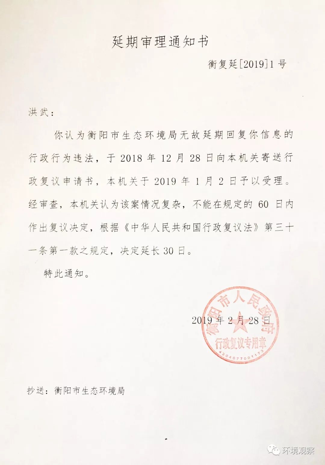 今天下午,正式收到衡阳市人民政府寄来的《延期审理通知书》和《衡阳市人民政府行政复议决定书》,快件早些天就已经到达本人原来的住址,后转到新地址,由于最近一直在一线调研,昨晚才回来,今天已正式收到。