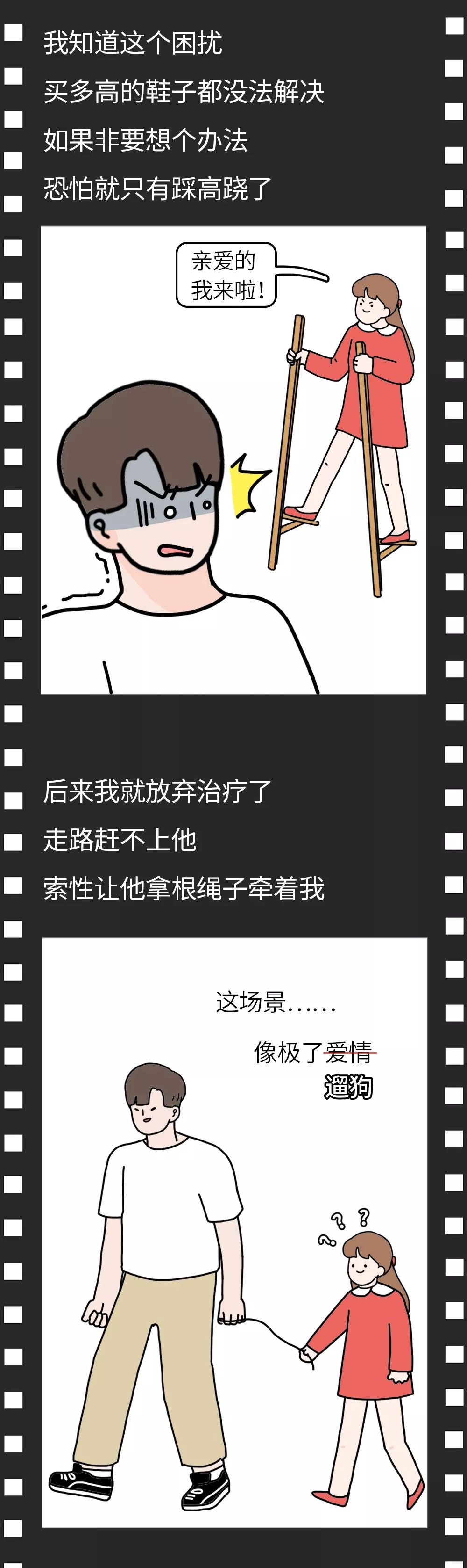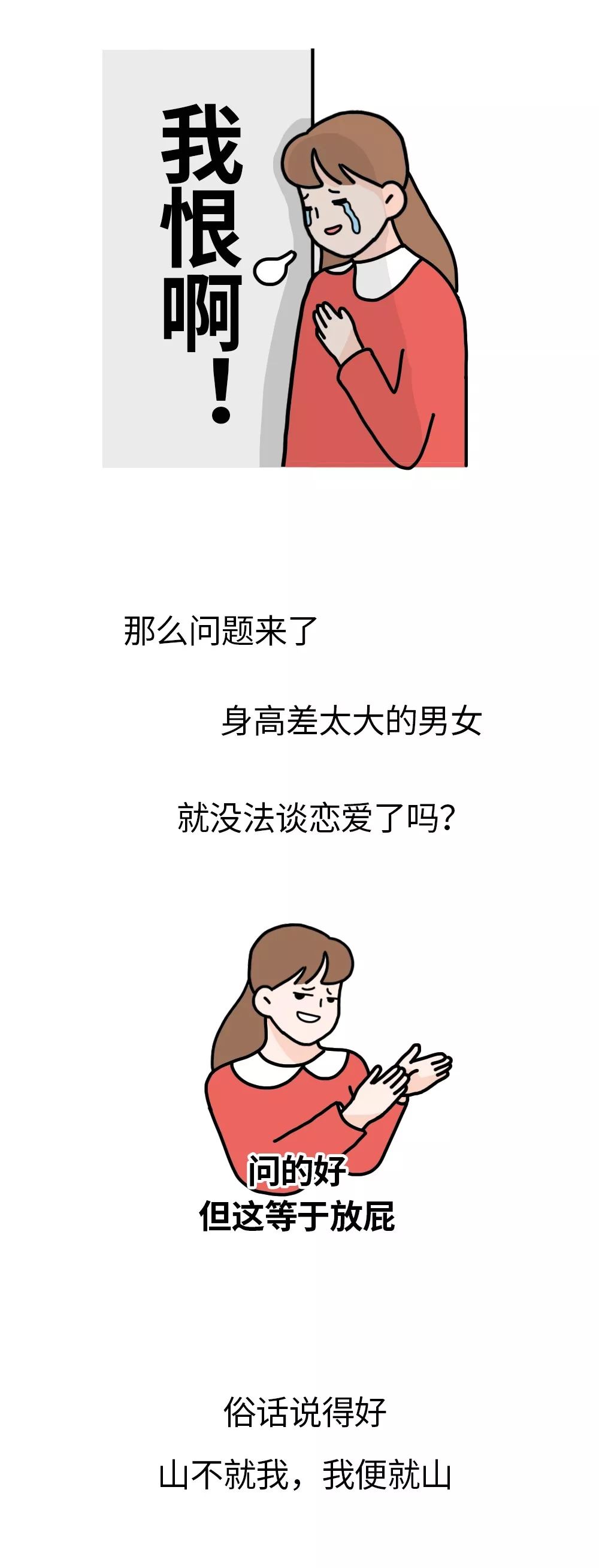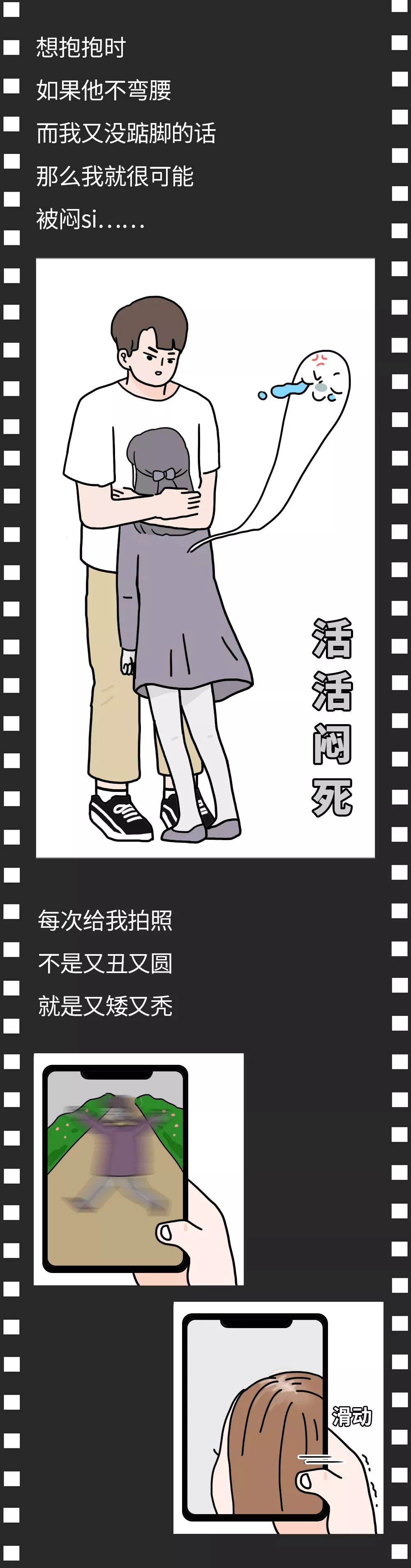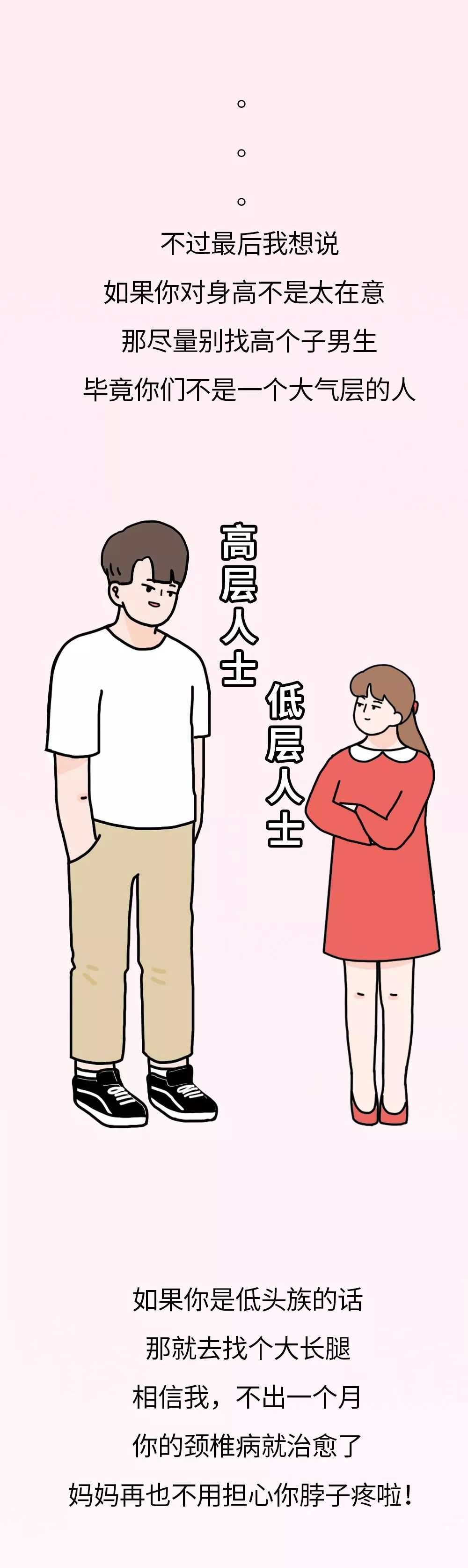 我敢说世上百分之九十九点九的女生都希望找个高个子男朋友,然而大多数女生别说高个子的,实际上连个男朋友都没有,咳咳,说错了重来。因为高个子男生看起来更有安全感,跟高个子男生谈恋爱也超幸福的!就比如:穿高跟鞋无压力,想穿几厘米就穿几厘米;就算胖成小猪了,男朋友也看见自己的双下巴,因为从男朋友的角度看,自己永远是完美的45度角;站在台阶上kiss超浪漫;下雨天被拎起来就能跨过水坑;看电影时坐下来往旁边一靠就是他的肩膀,很贴心了;不管刮风下雨还是烈日当头,都能躲在他身后;要是哪天想呼吸下新鲜空气,让他把自己背起来就可以了;壁咚就像在拍电影,脑袋正好贴近他的胸膛能听见扑通扑通的心跳;最重要的是吵架他必须向自己低头......总之谈一场最萌身高差的恋爱,虽然会闹出很多笑话,但整体来说并没有那么糟糕。