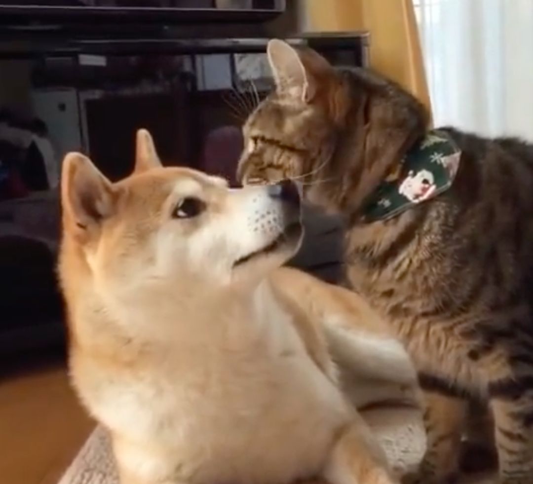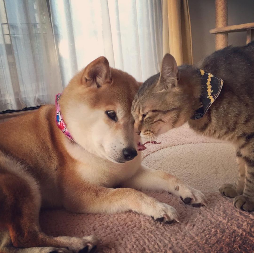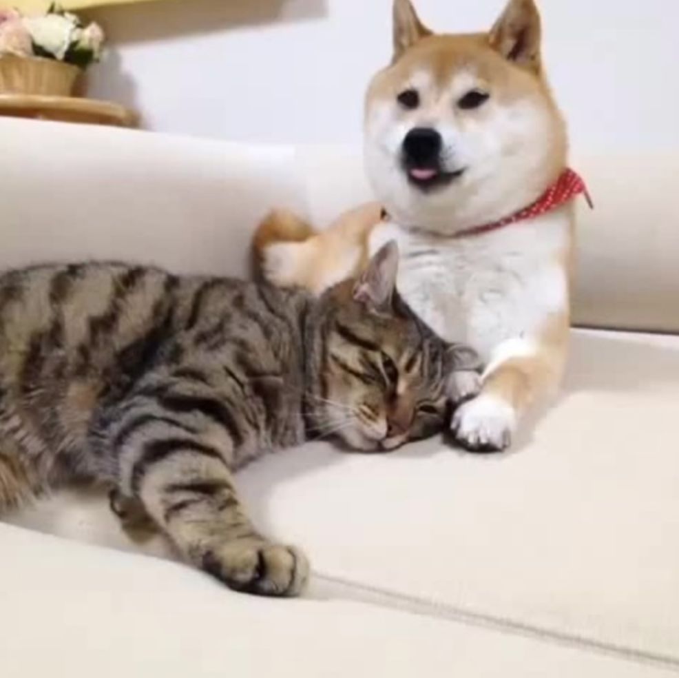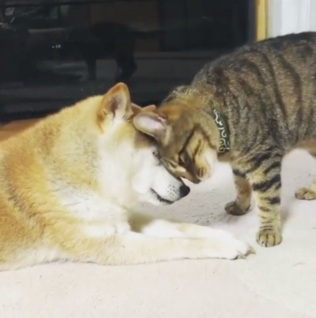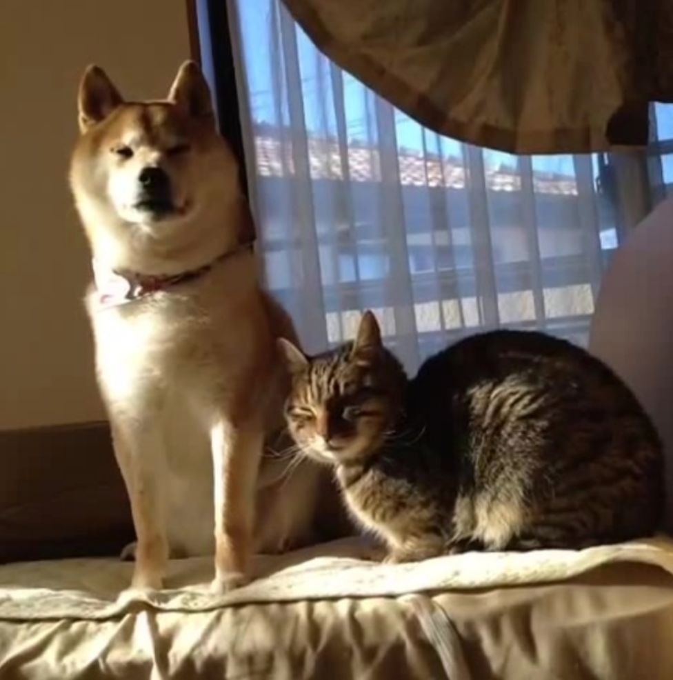 银杏也是家中收养的一只猫咪,常听人说猫狗水火不容,然而感受一下Kabosu和银杏的日常相处模式: