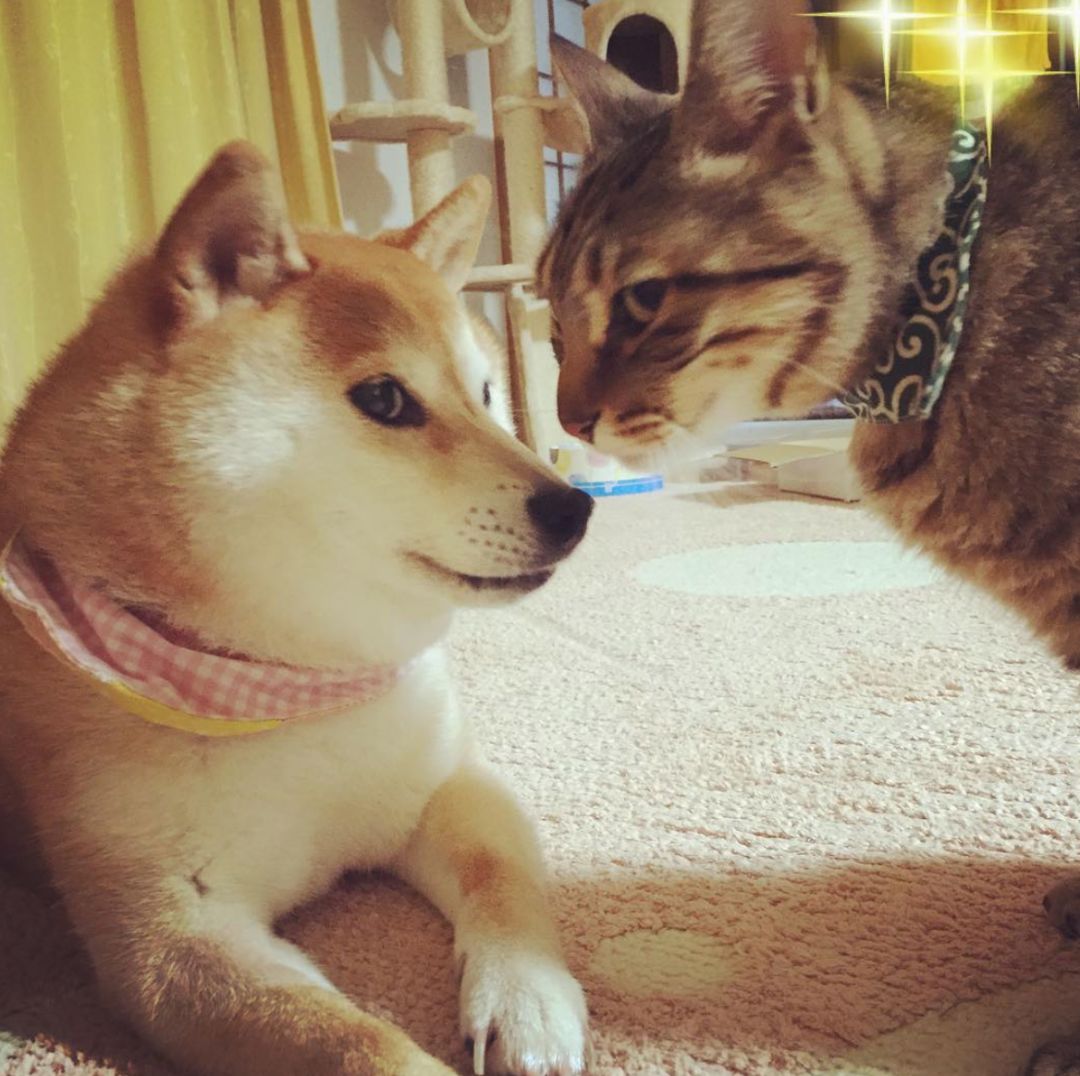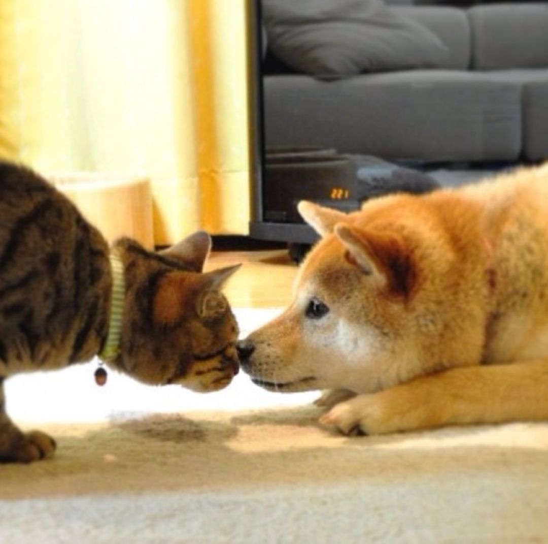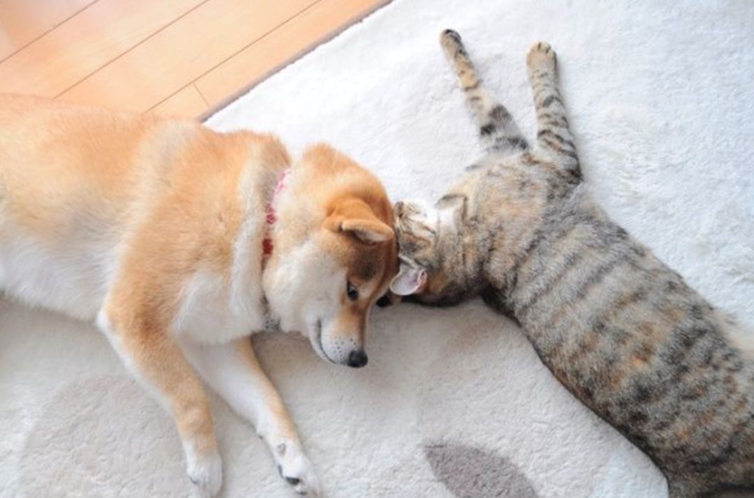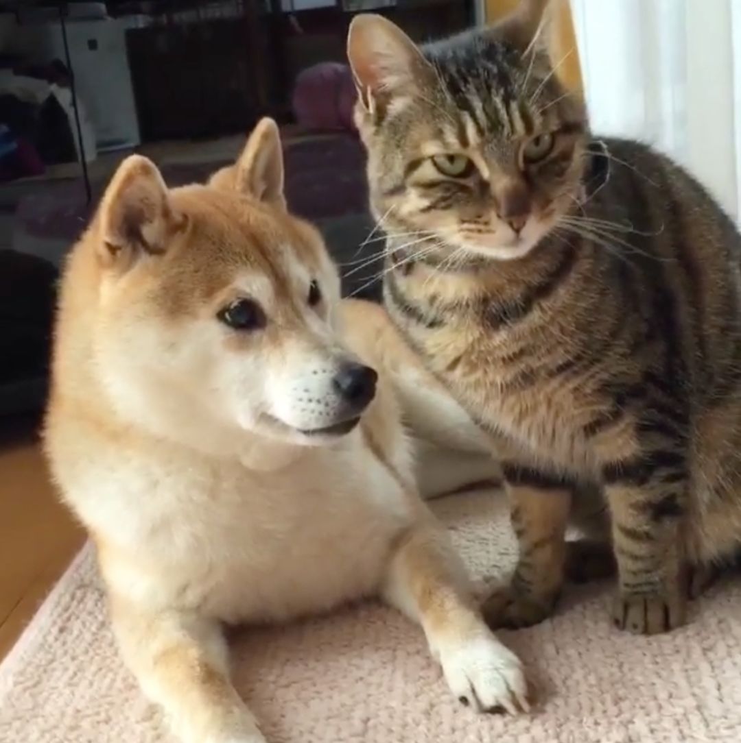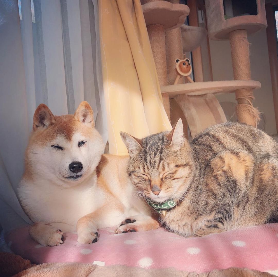银杏也是家中收养的一只猫咪,常听人说猫狗水火不容,然而感受一下Kabosu和银杏的日常相处模式: