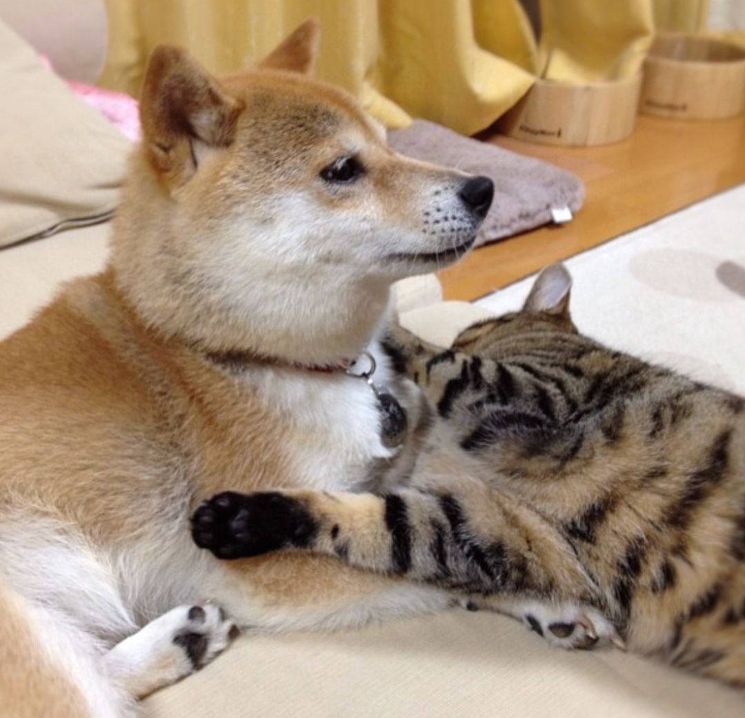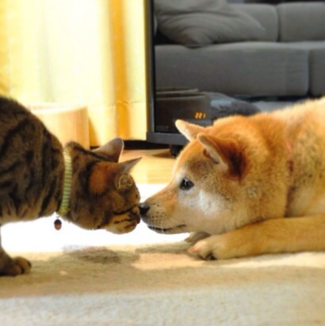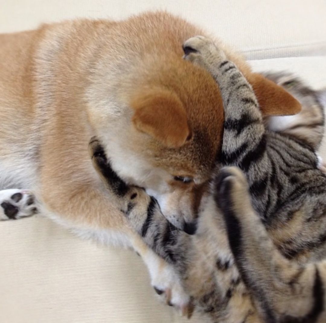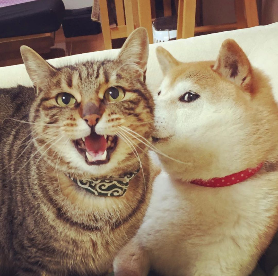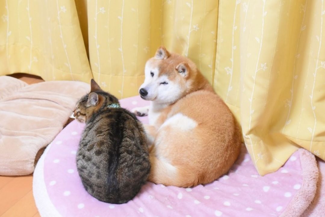 银杏也是家中收养的一只猫咪,常听人说猫狗水火不容,然而感受一下Kabosu和银杏的日常相处模式: