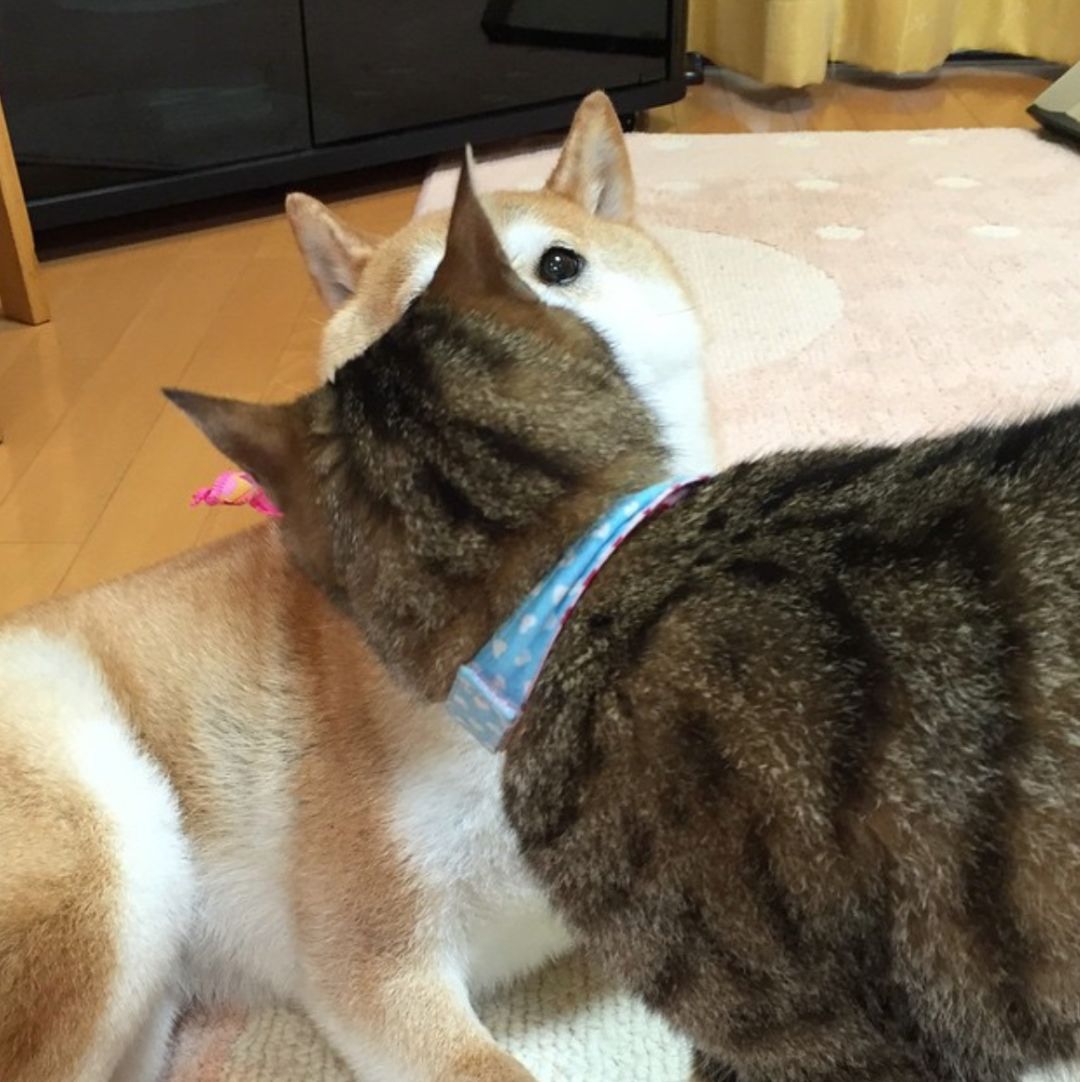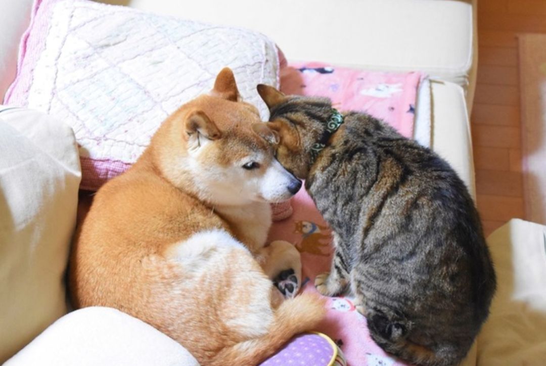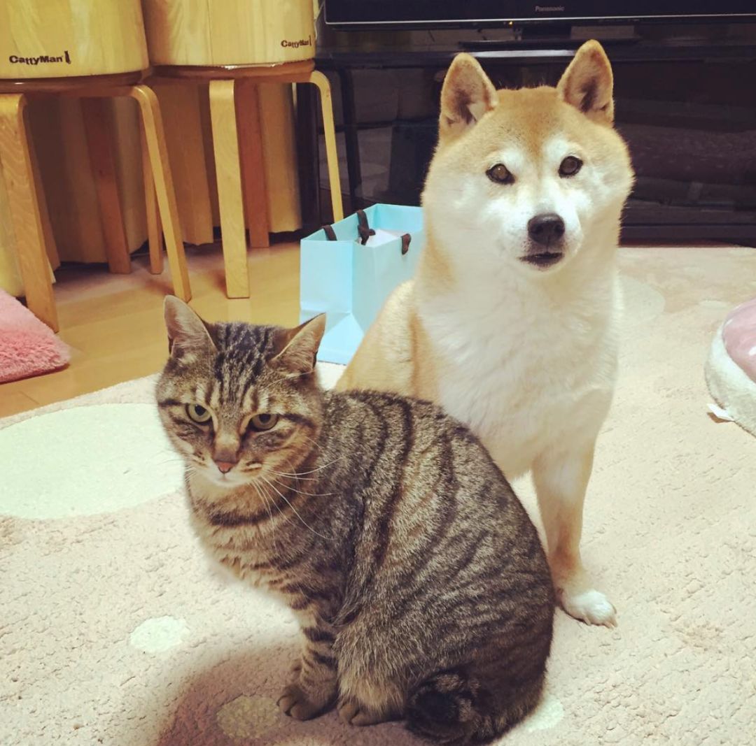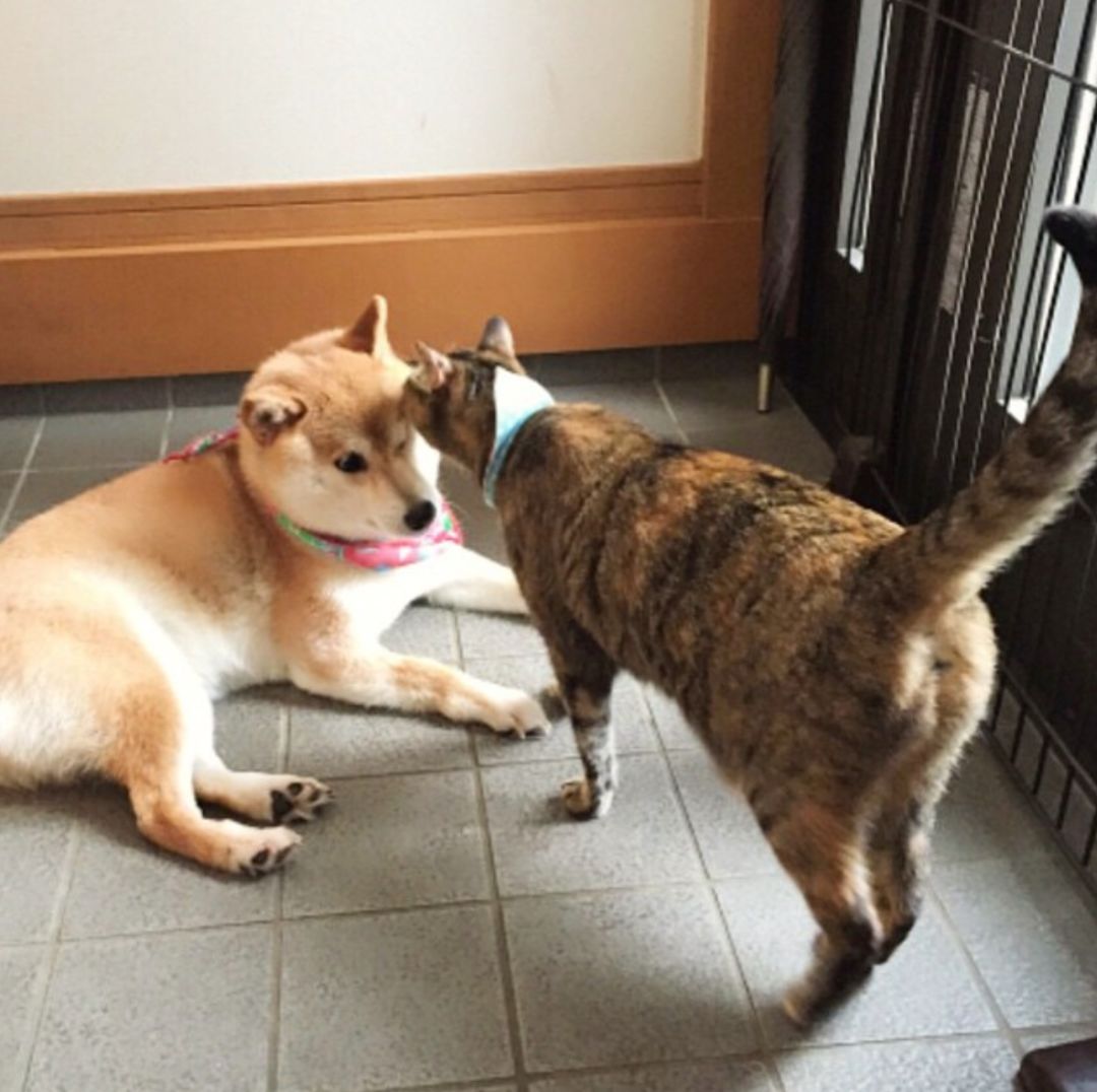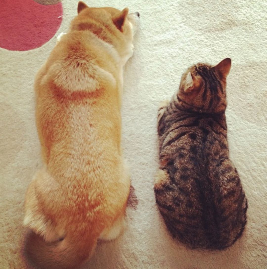 银杏也是家中收养的一只猫咪,常听人说猫狗水火不容,然而感受一下Kabosu和银杏的日常相处模式: