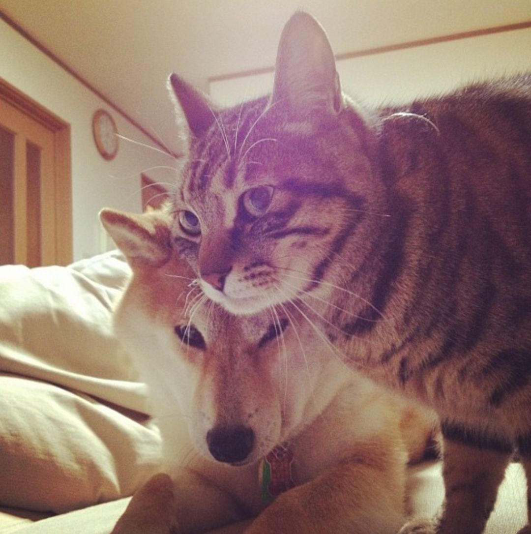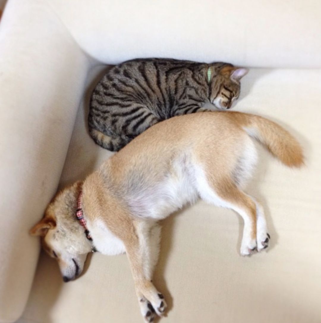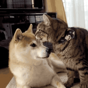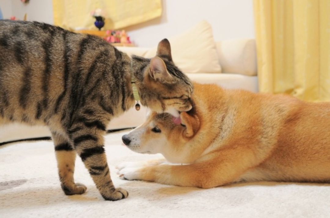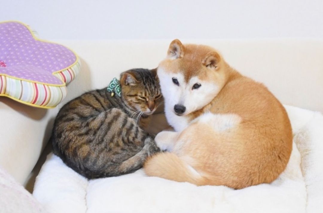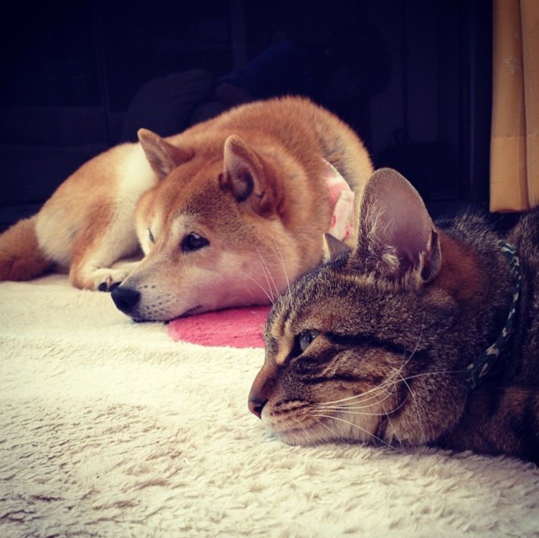 银杏也是家中收养的一只猫咪,常听人说猫狗水火不容,然而感受一下Kabosu和银杏的日常相处模式: