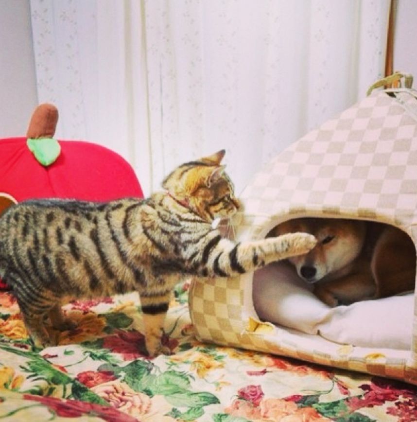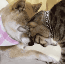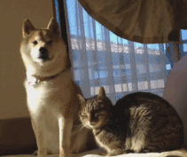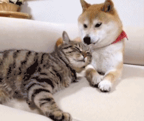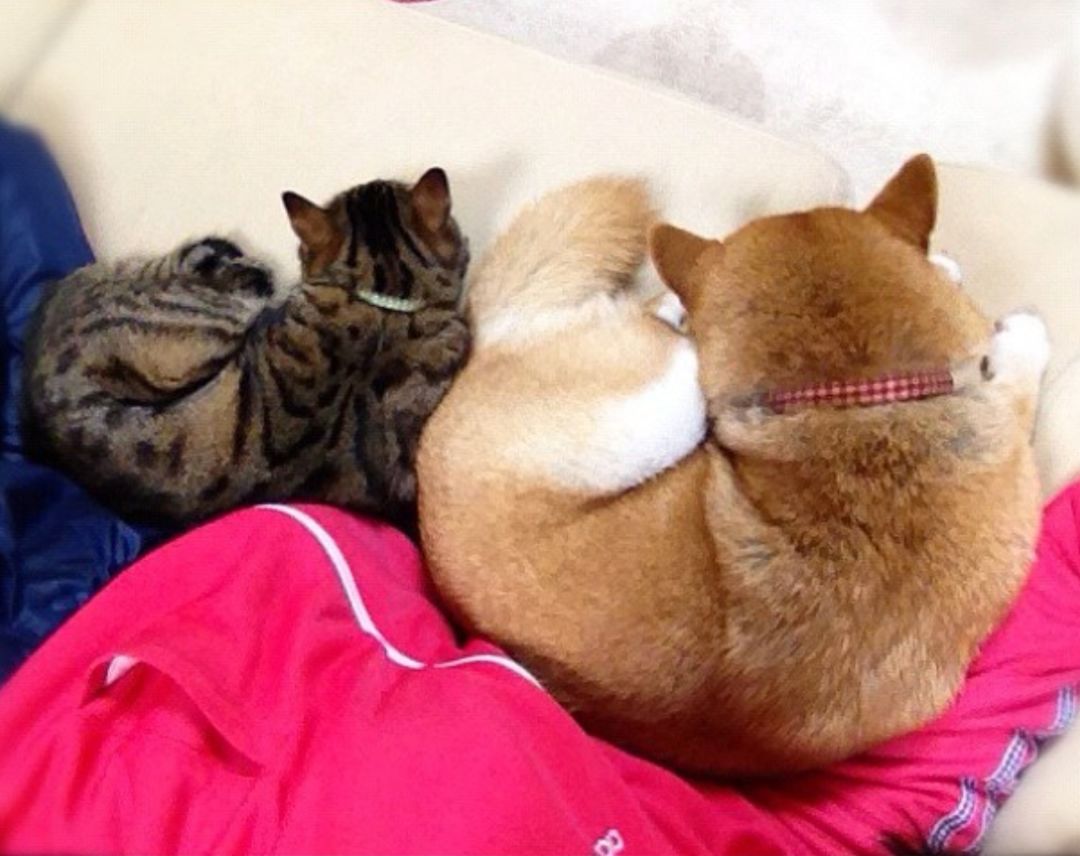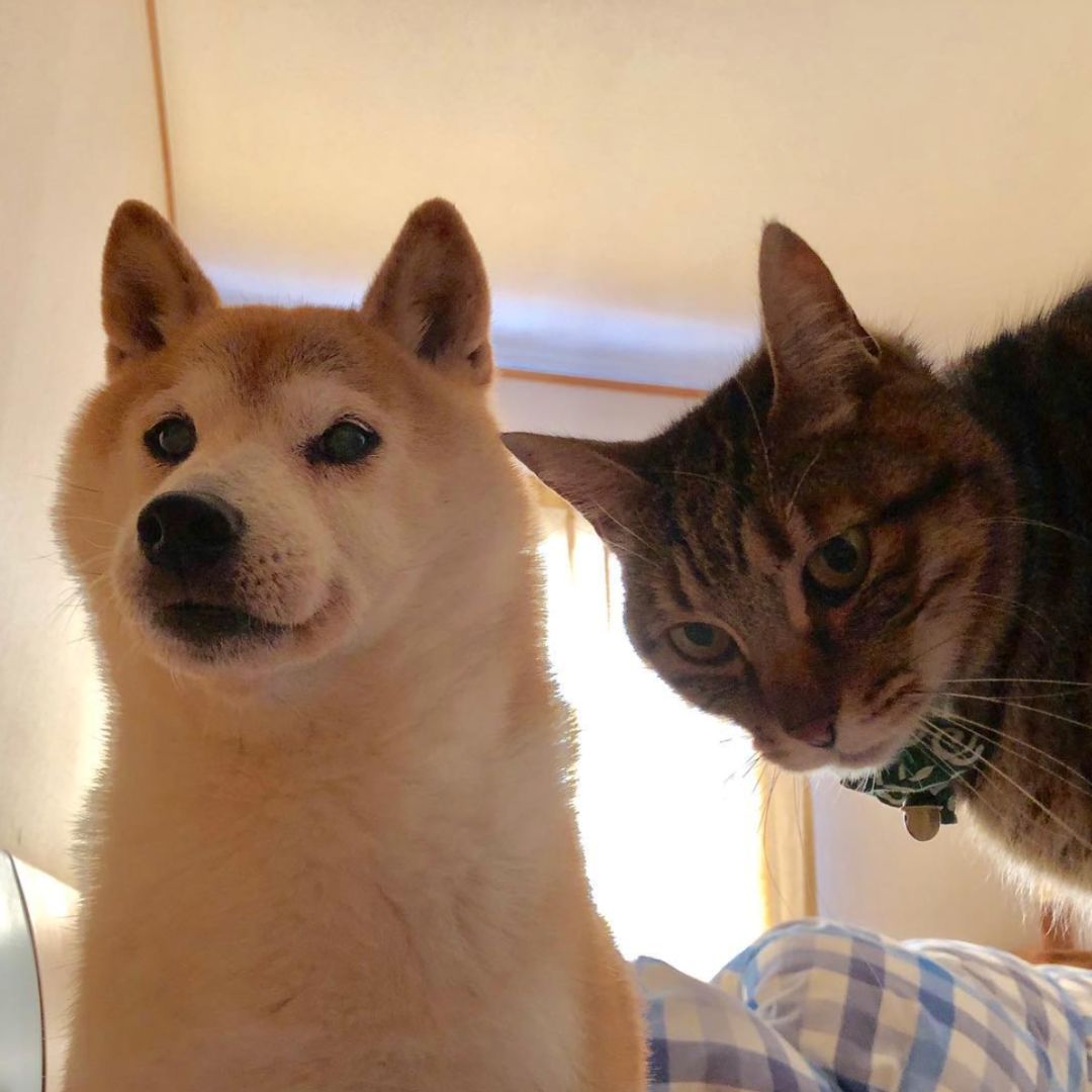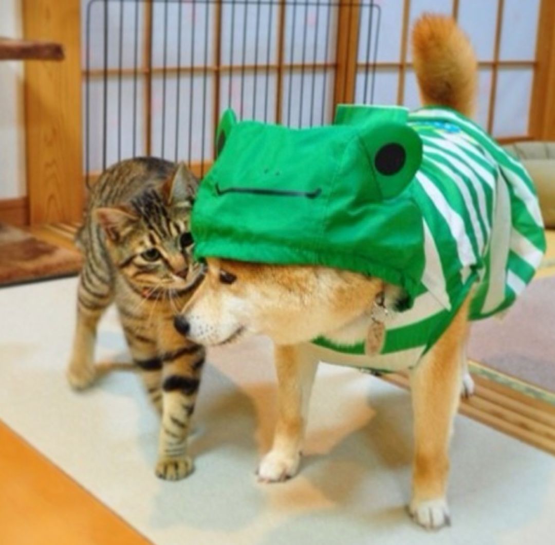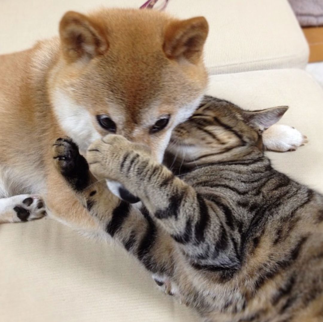 银杏也是家中收养的一只猫咪,常听人说猫狗水火不容,然而感受一下Kabosu和银杏的日常相处模式: