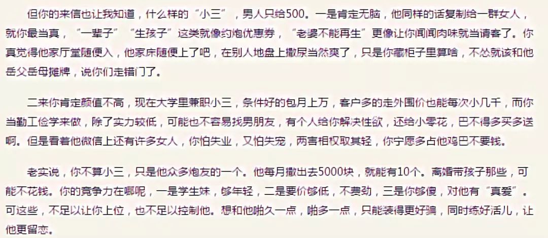 曾经有位女孩向她咨询情感问题,说自己当了小三,但男人只肯给自己500元生活费,应该怎么办?