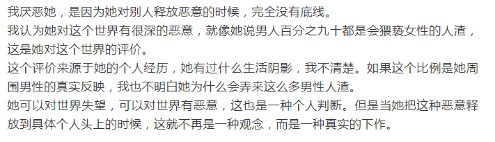 她扒下那些虚伪的男人的道德底裤,同时也从不顾忌伤害无辜。比如她在和方舟子吵架时,会用无比恶毒的语言去攻击方舟子的幼女,完全没有了应有的底线。