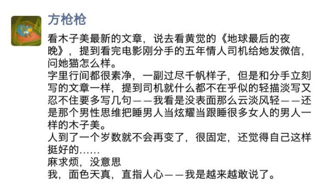 媒体人方枪枪曾经在朋友圈评价过木子美对于司机的态度,他说木子美依旧是某些男性的思维方式,“把睡男人当炫耀”,这与男人把睡女人当炫耀的性质是一样的。