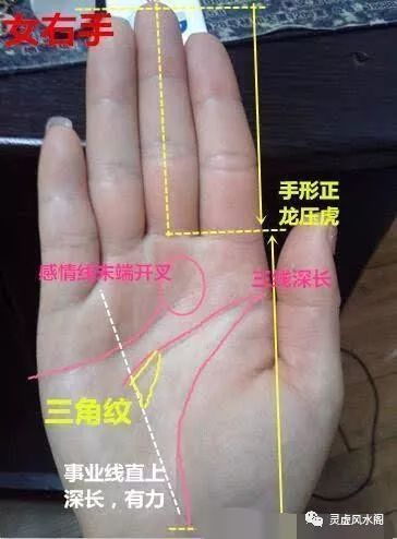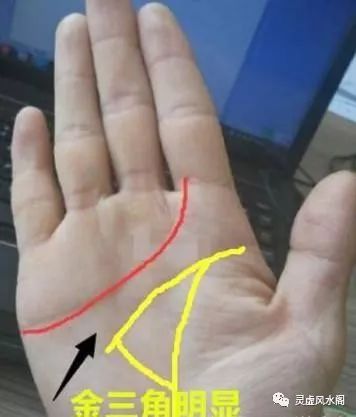 手心三角纹。手心三角纹属于大财库,财库紧闭,家财资方来聚,注定财产日渐丰厚,无论是工作或者生活上,都会财源滚滚。如果手上同时有大小两个三角纹套叠在一起更加财运旺盛,就像这位命主一样,手相各方面都比较吉利,事业上一开始工作就收入不错,后运更加丰厚。