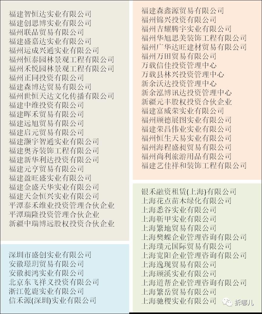 比如伴随泰禾集团、泰禾投资一起买入东兴证券的,还有一只私募基金叫新余泓博讯达投资管理中心。还比如,曾买入国统股份的锦兴投资,曾买入福晶科技的万载县林兴投资管理中心,曾买入尖峰集团的新余汇恒瑞投资管理合伙企业、新余中盛恒兴投资管理合伙企业两只私募基金,都在影子的范畴。