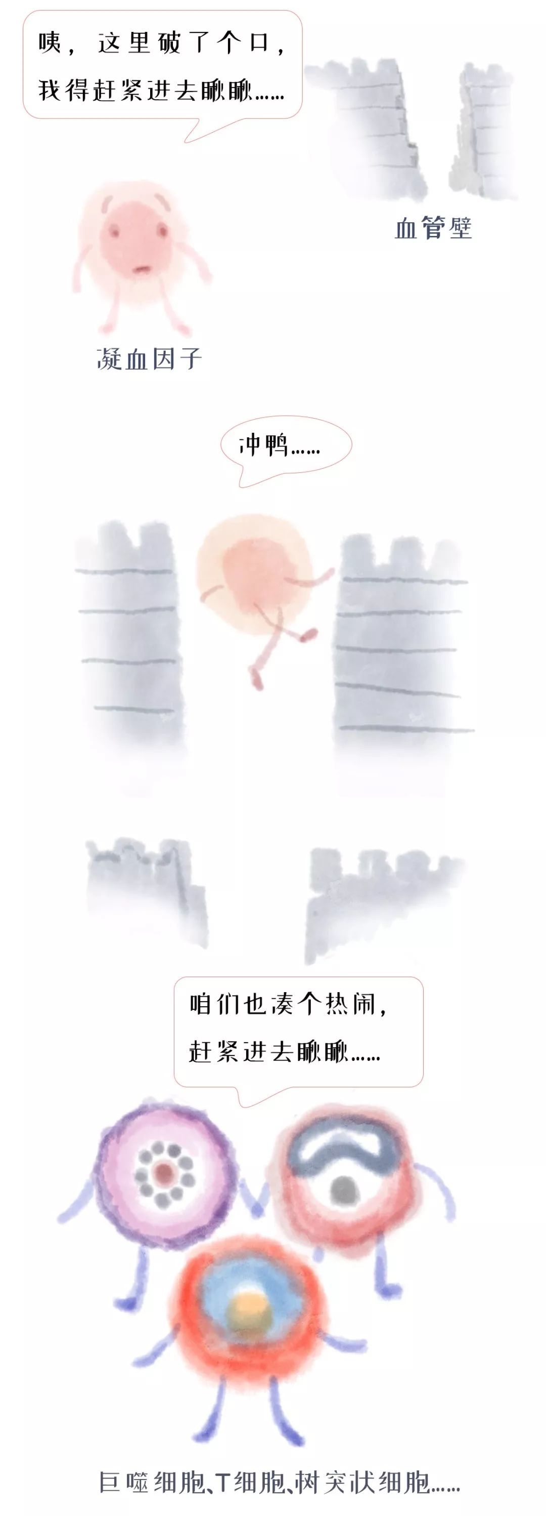 这些跑出去的凝血因子、巨噬细胞、T细胞等,本来是自各司其职的乖乖仔,到了“外面的世界”,像放肆的坏小孩开始撒野。