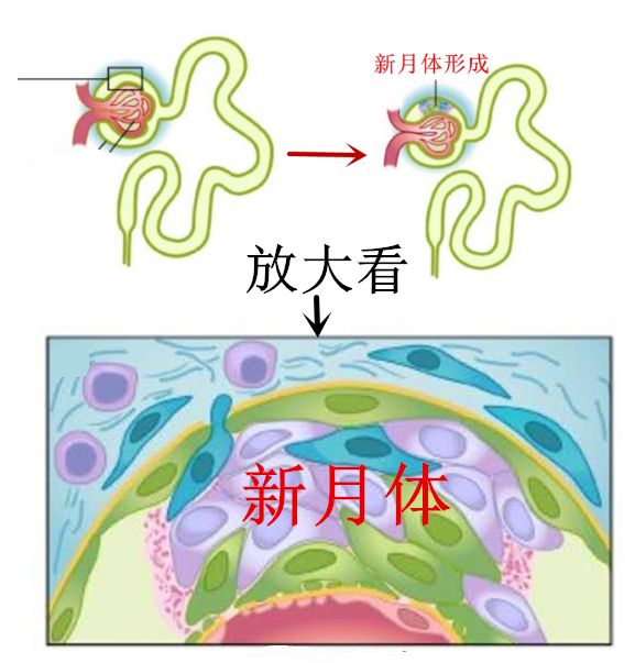 许多种类的肾小球疾病,都可能出现新月体,如IgA肾病,紫癜性肾炎、ANCA相关小血管炎、狼疮肾炎、膜增生性肾小球肾炎、抗肾小球基底膜(GBM)抗体病、感染后肾小球肾炎。