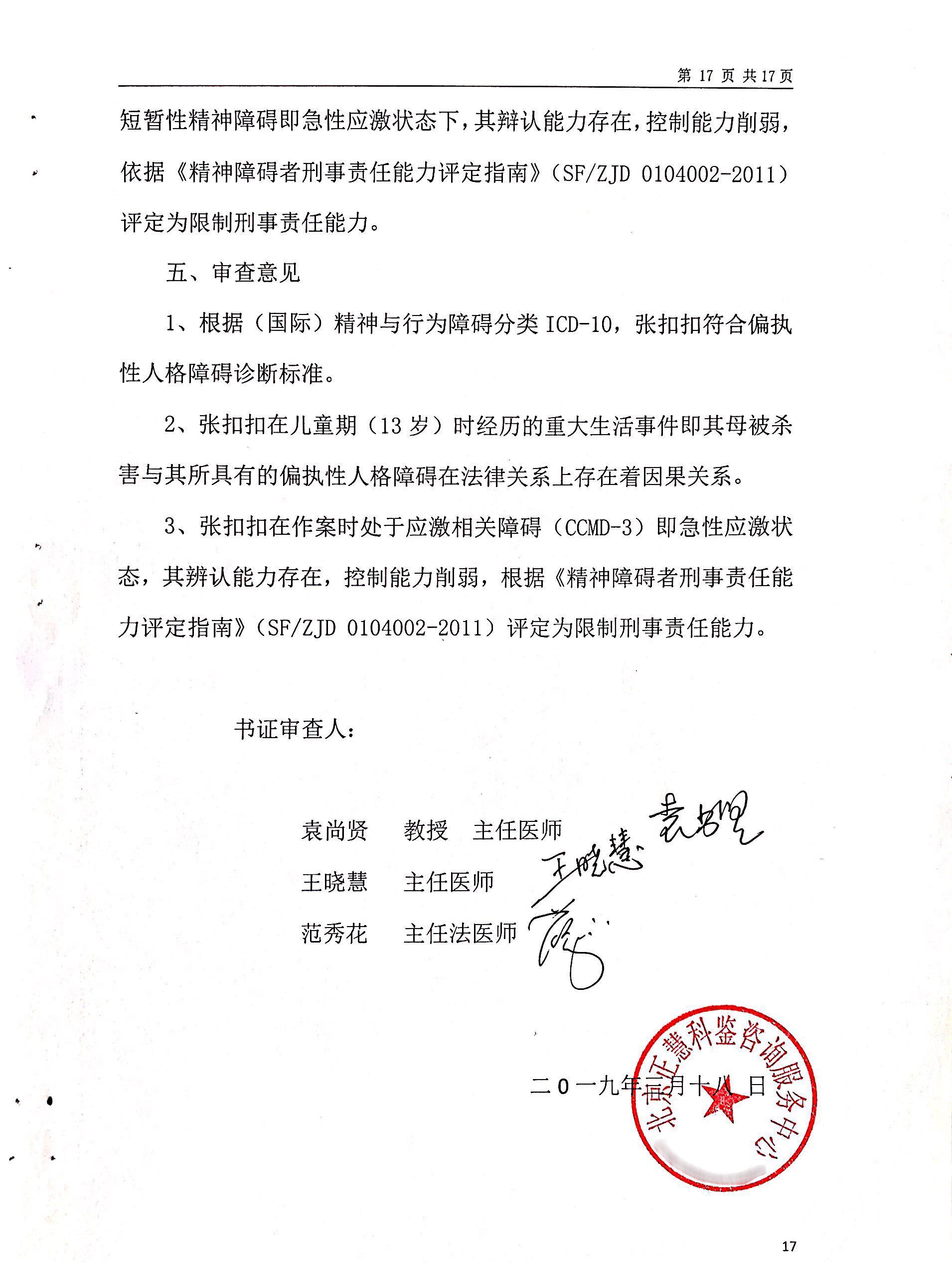3、张扣扣在作案时处于应激相关障碍(CCMD-3)即急性应激状态,其辨认能力存在,控制能力削弱,根据《精神障碍者刑事责任能力评定指南》(SF/ZJD 0104002-2011)评定为限制刑事责任能力。
