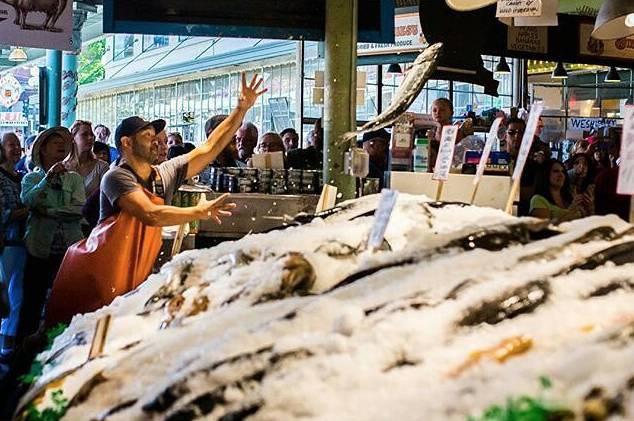 但是,派克市场的鱼市却与寻常意义上的鱼市截然不同,这里几乎每天都充满着熙熙攘攘的人群,来往的游客更是络绎不绝,很难想象,这个几乎可以称之为“鲜血淋漓”的地方,竟然是一个快乐的天堂。
