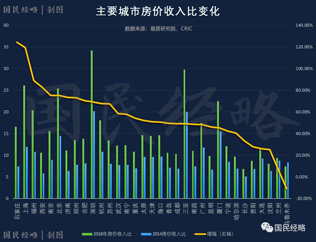 石家庄、上海房价收入比翻了一番还多,而福州、南京、西安、合肥、郑州、济南等热门二线城市增幅均超过70%。