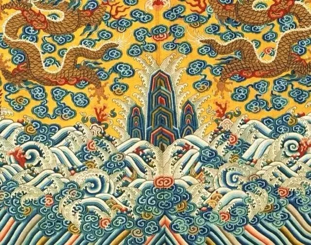 不像现在印个logo,“全员恶人”就完了。清代的龙袍、将相的朝服上都会绣一个“海水江崖纹”。
