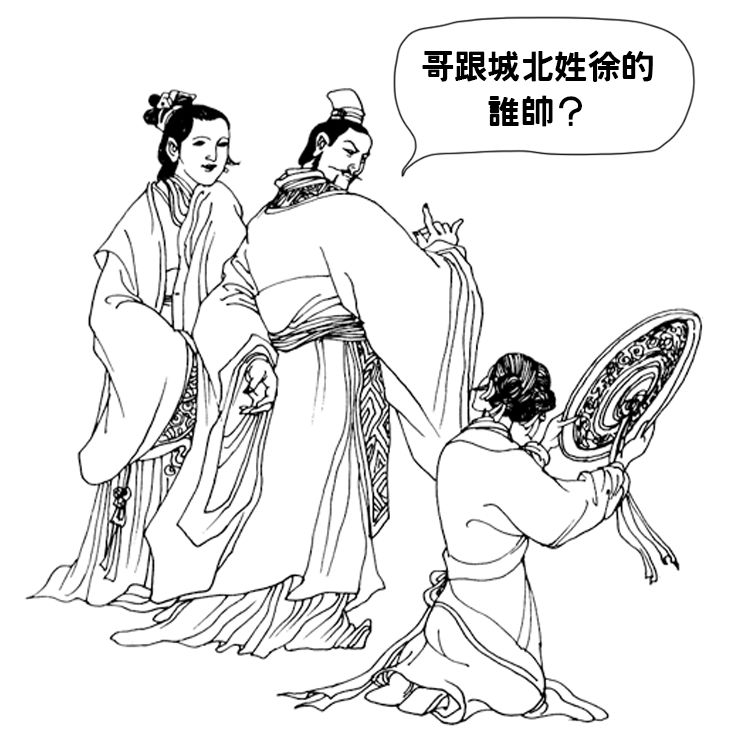说他长得高,八尺有余,身材伟岸,早上穿戴好了,对着镜子问:哥跟城北姓徐的谁帅?
