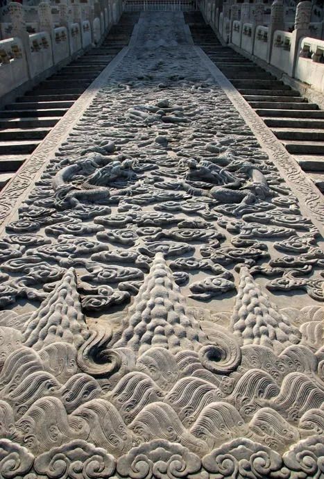 再比如,宫殿台基上的丹陛,上面经常是“飞龙在天”、“凤凰涅槃”、“祥云团团”,气韵生动。