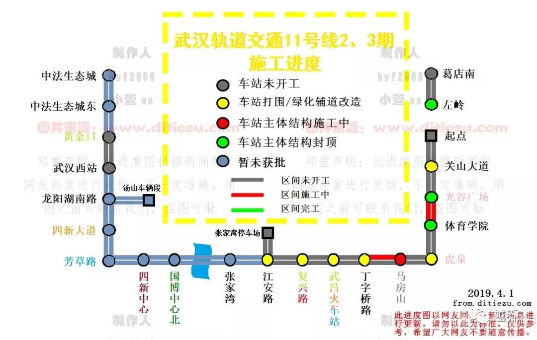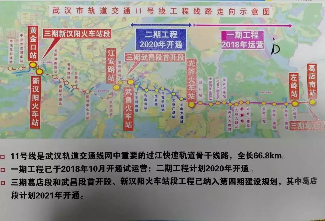 武汉轨道交通11号线三期葛店段起于11号线左岭站,沿高新大道以地下方式展线,止于葛店南站,长3.7公里。设地下二层岛式地铁车站,与武黄及武冈城际铁路都可实现换乘,总投资约17.19亿元,建设工期26个月。若下月实现开工,线路预计将在2021年中旬开通。