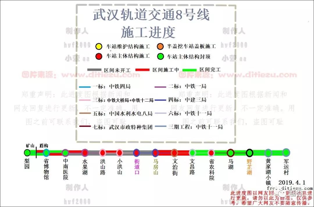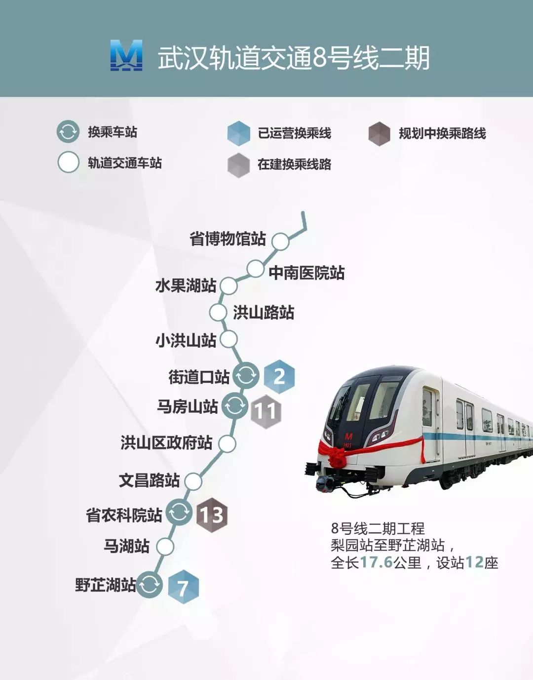 武汉轨道交通8号线二期工程呈南北走向,线路起于一期工程终点梨园站,经东湖路、水果湖路、八一路、珞狮北路、书城路、野芷湖西路至野芷湖,全长17.6 公里,均为地下线设站12座。目前已全面开工,其中中南医院站、文昌路站等5座车站主体结构完工站, 26个单线区间(加出入场线),已贯通9个。