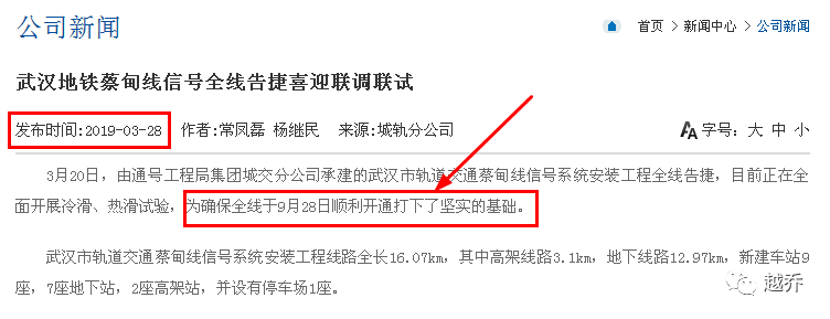 公众号【越乔】获悉,通号工程局集团有限公司网站新闻显示:3月20日,由通号工程局集团城交分公司承建的武汉市轨道交通蔡甸线信号系统安装工程全线告捷,目前正在全面开展冷滑、热滑试验,为确保全线于9月28日顺利开通打下了坚实的基础。