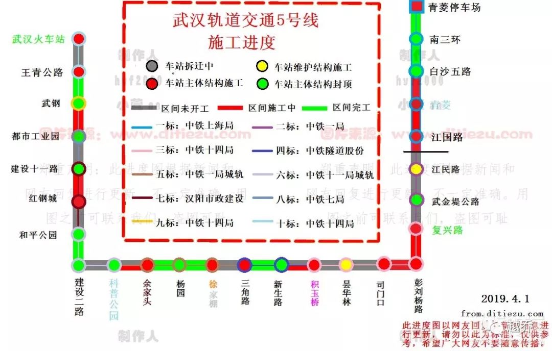 公众号【越乔】获悉,武汉轨道交通5号线全长33.57公里,设站25座(地下站21个,高架站4个),目前新生路站、武钢站等5座车站主体结构完工,杨园站至余家头站等6个单线盾构区间实现贯通,高架区间全部在建。