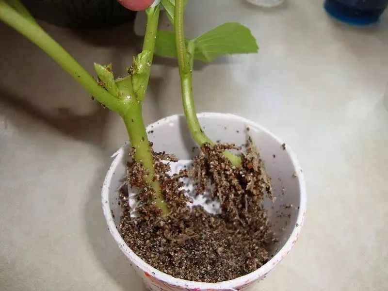 接下来就是要准备一些生根粉生根溶液,将绣球花的枝条底部浸泡在生根粉或生根溶液里面,浸泡大概两三个小时之后再进行栽种,如果是生根粉,枝条底部蘸上一些生根粉,就可以扦插在土壤中。