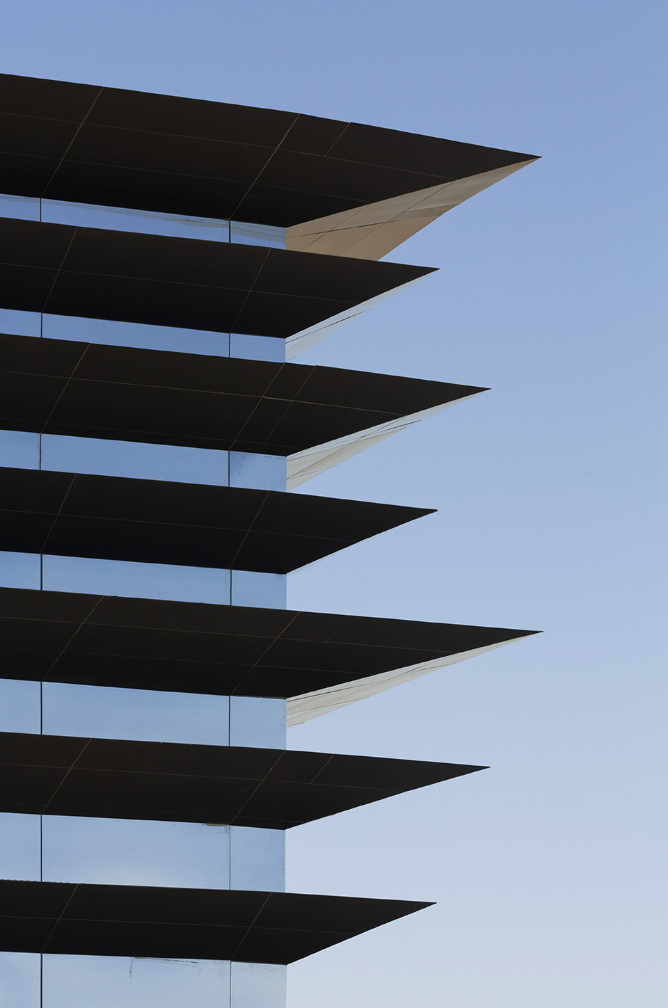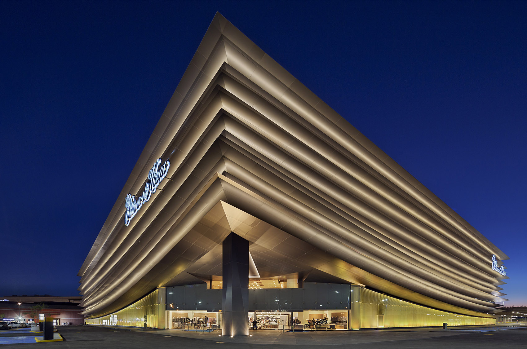 这座经典的百货商场拥有一个严格而规整的四方形体量,项目的主要挑战也来源于此。设计的主要思路是通过材料的非物质化来创建一种虚实相间的、具有渗透性的界面,从而实现分层浮动的效果。外立面由不同尺寸和截面的水平元素构成,带来整洁而又流畅的观感,同时在商场的角落形成一个主要的入口。该入口通过宽阔的迎宾前厅得到强调。前厅不仅是建筑中的过渡元素,还通过其双层高的体量为空间赋予了宏伟的气势,并直接在立面上表现出来。从建筑的首层和以及美食区所在的二层均可以直接看到外部的景象,打破了多数百货商场无窗墙的设计常规。选材的优化对于立面的调整而言至关重要。 该设计在立面的每个“层级”上都使用了铝板,尽管它们有着不同的尺寸、截面和运动形态。这些“实心层”单元是由固定在钢结构上的铝板组成,长度从1.80米至3.40米不等。从外部看,那些“虚”的部分实际上是铝制的镜面板,反射出建筑所在的环境、周围的植被以及克雷塔罗市的天空。这种反射效果为建筑赋予了一种透明性,同时使每个“实心层”仿佛在磁力的作用下保持着浮动的状态。 更新后的建筑受到了克雷塔罗市市民的喜爱,如今已经成为了城市的新地标。不仅如此,由于其看上去像是一本打开的书,因而还获得了“the great book”的外号。Palacio de Hierro是Antea Lifestyle Center综合体的一部分,是其主要的商场之一。本次外立面的改造旨在为建筑赋予独特的外观并突出商场的开放性,使其与周围建筑的封闭式体量形成对比。Palacio de Hierro商场和Antea商场均由Sordo Madaleno Arquitectos设计。