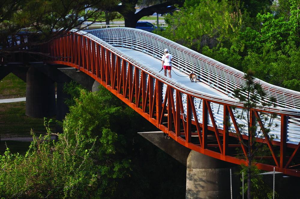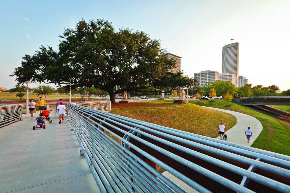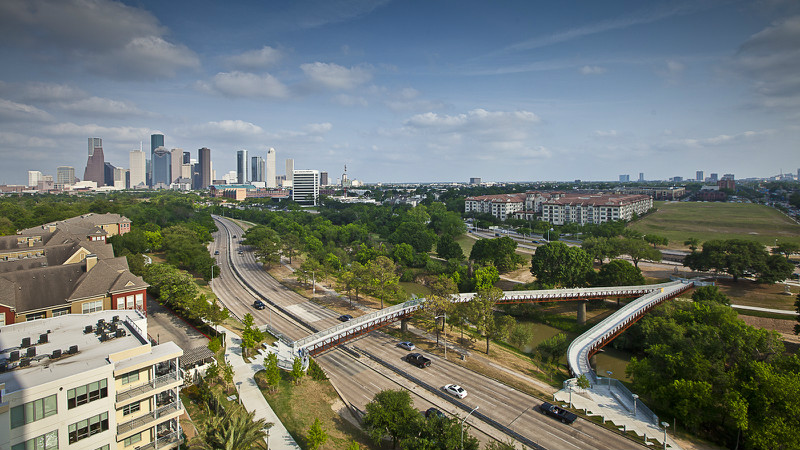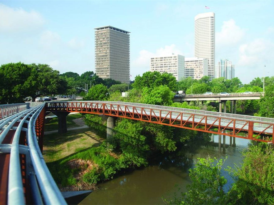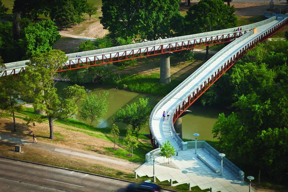 罗斯蒙特人行天桥和轨迹位于美国德克萨斯州的休斯敦,在这里可以一览整座城市的景色。项目的目的在于将北部的社区、南部的港湾和之间的通道连接起来,使之形成一个整体。设计者充分利用了现有的地形布局了交通设施并保证了路人可以欣赏到路边的美丽风景。设计者更是把港湾两岸的艾伦林荫道和纪念大道相接,构成了占地约200公顷的绿色空间。大桥将行人放置到一个略微倾斜的表面上,满足了ADA对于广泛访问率的要求,游览者可以站在一个设计巧妙优雅的通道上多角度的欣赏海湾美景。桥高3.6576米,长239米,通过钢筋水泥支撑。码头处设有LED灯光照明和指示,保证了夜间使用的安全便捷性。除此之外,这里也成为了行人和自行车爱好者的天堂,还是摄像着取景休斯敦美景的好地方。