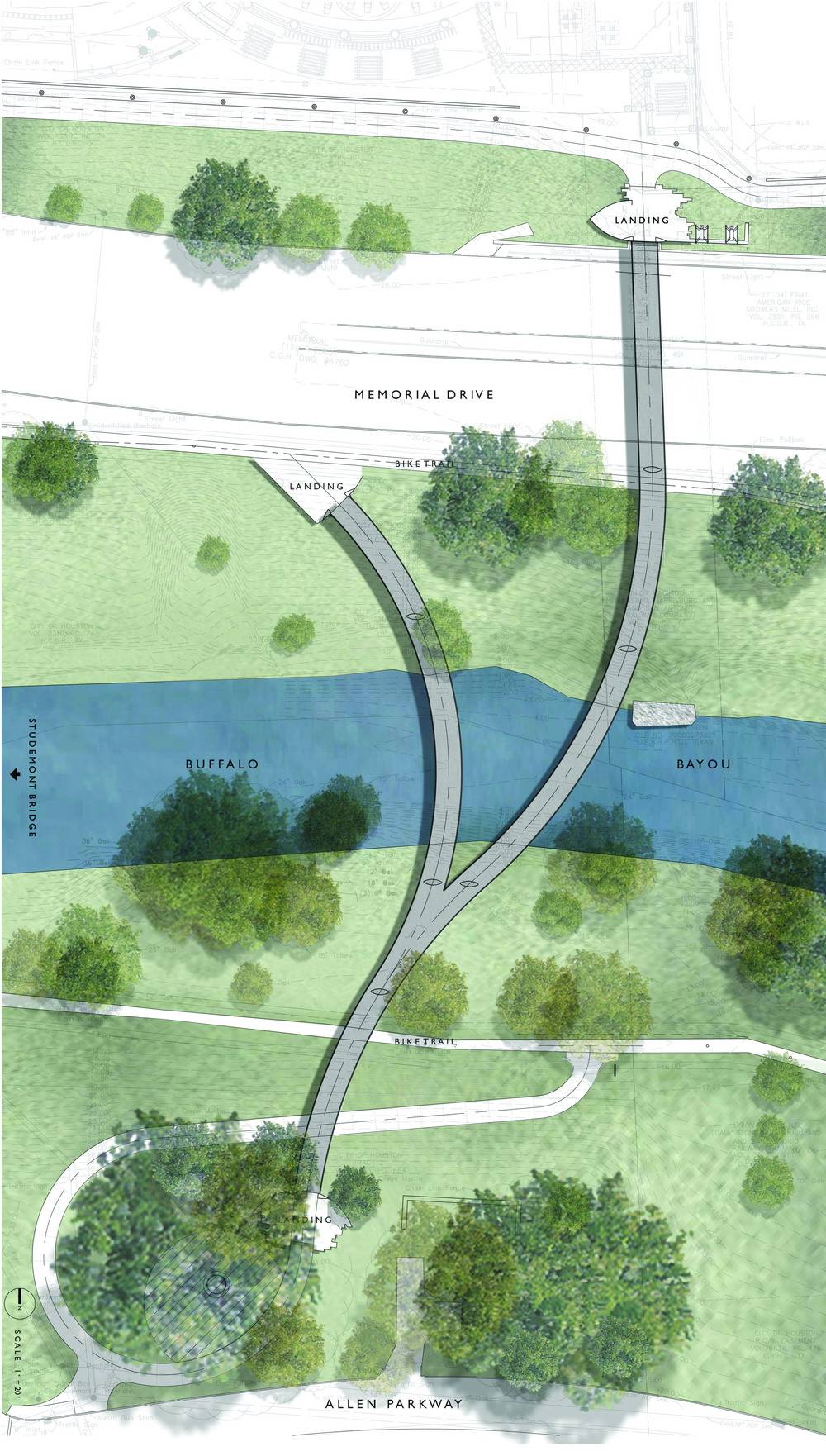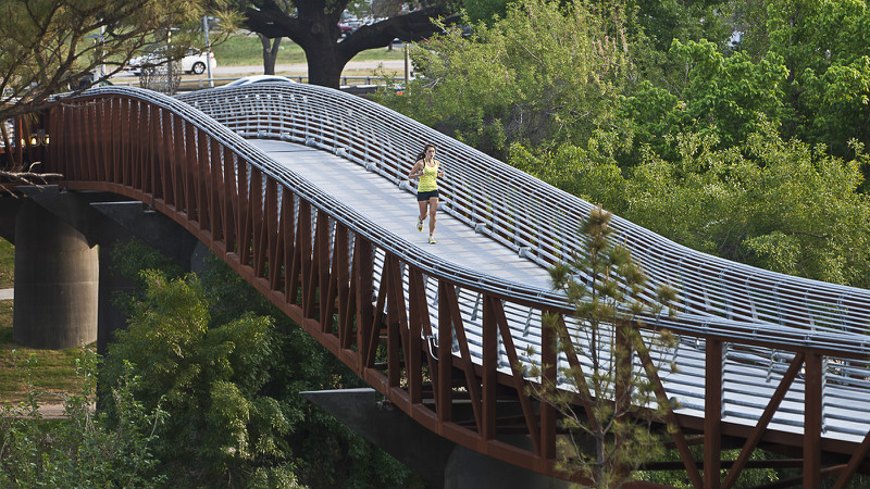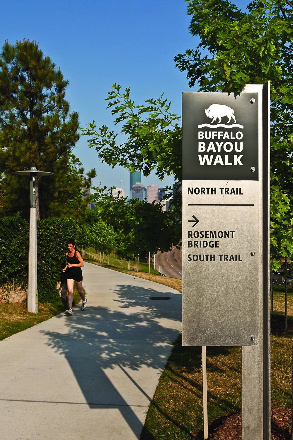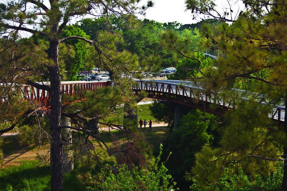 罗斯蒙特人行天桥和轨迹位于美国德克萨斯州的休斯敦,在这里可以一览整座城市的景色。项目的目的在于将北部的社区、南部的港湾和之间的通道连接起来,使之形成一个整体。设计者充分利用了现有的地形布局了交通设施并保证了路人可以欣赏到路边的美丽风景。设计者更是把港湾两岸的艾伦林荫道和纪念大道相接,构成了占地约200公顷的绿色空间。大桥将行人放置到一个略微倾斜的表面上,满足了ADA对于广泛访问率的要求,游览者可以站在一个设计巧妙优雅的通道上多角度的欣赏海湾美景。桥高3.6576米,长239米,通过钢筋水泥支撑。码头处设有LED灯光照明和指示,保证了夜间使用的安全便捷性。除此之外,这里也成为了行人和自行车爱好者的天堂,还是摄像着取景休斯敦美景的好地方。
