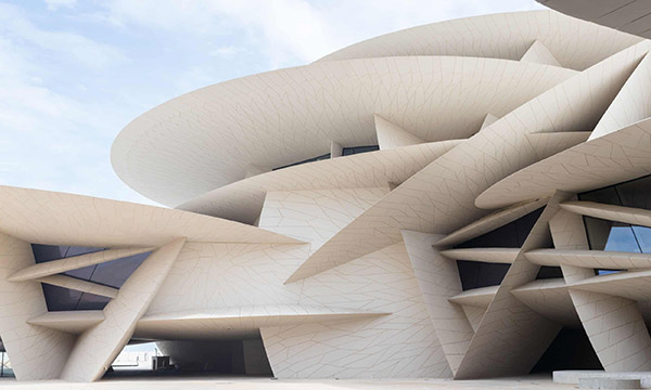 卡塔尔国家博物馆的设计理念非常复杂,耗时18年才建造完成。539个圆盘上覆盖着7.6万块玻璃纤维增强混凝土面板,其中的技术操作需由弗兰克•盖里(Frank Gehry)工作室研发的软件以及超过4亿美元的预算才能实现。和许多基于电脑生成的流体建筑不同,该博物馆具有严密的几何结构和坚固的材料支撑,仿佛它可以从地上生长出来。博物馆在粗糙和光滑之间找到平衡:圆盘有水晶般的精度,向着边缘逐渐变得锋利,而庭院里则拥有沙质表面,就像是准备接待准备好接待流动商人的商队。