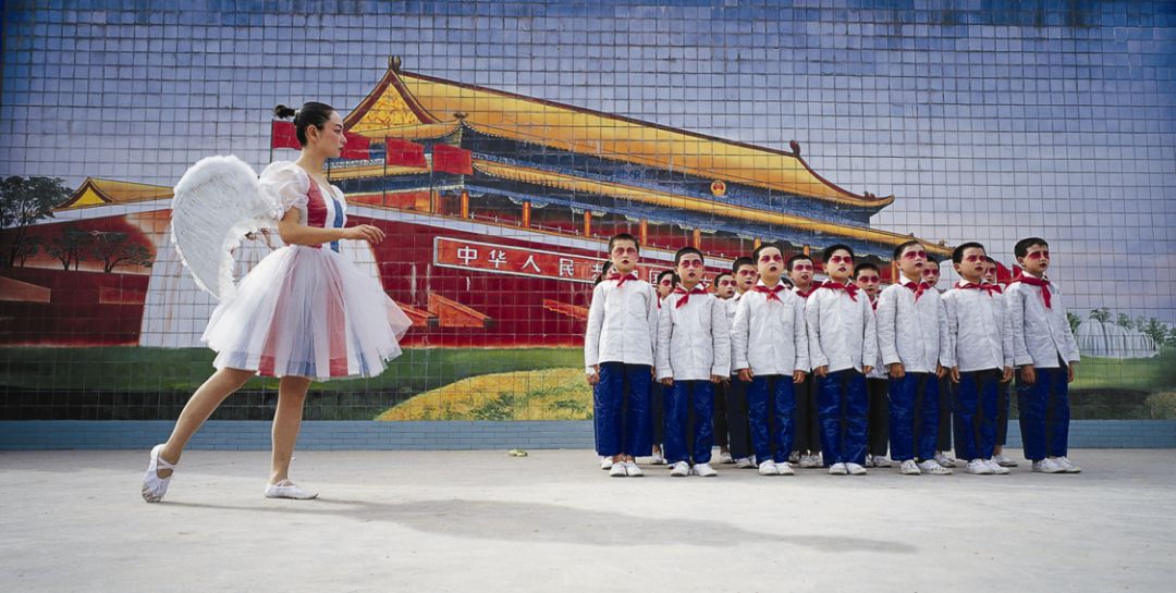 我去到新胜镇上的一个小学,找到同学们,我把自己扮成天使的样子,代表一种希望和慰藉,跟他们一起拍照留念。这是他们最后几天在这里上学,之后,他们就要各奔东西。