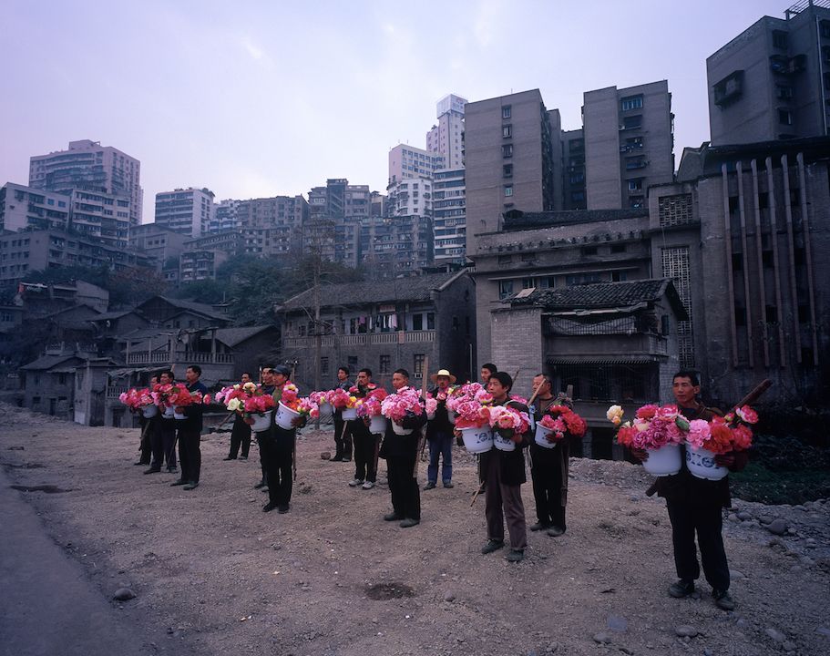 他们抱着假花在这个城市里面穿行,走过修修拆拆的地方。就像棒棒军平时为别人送货一样,只是这一次的假花没有目的地。